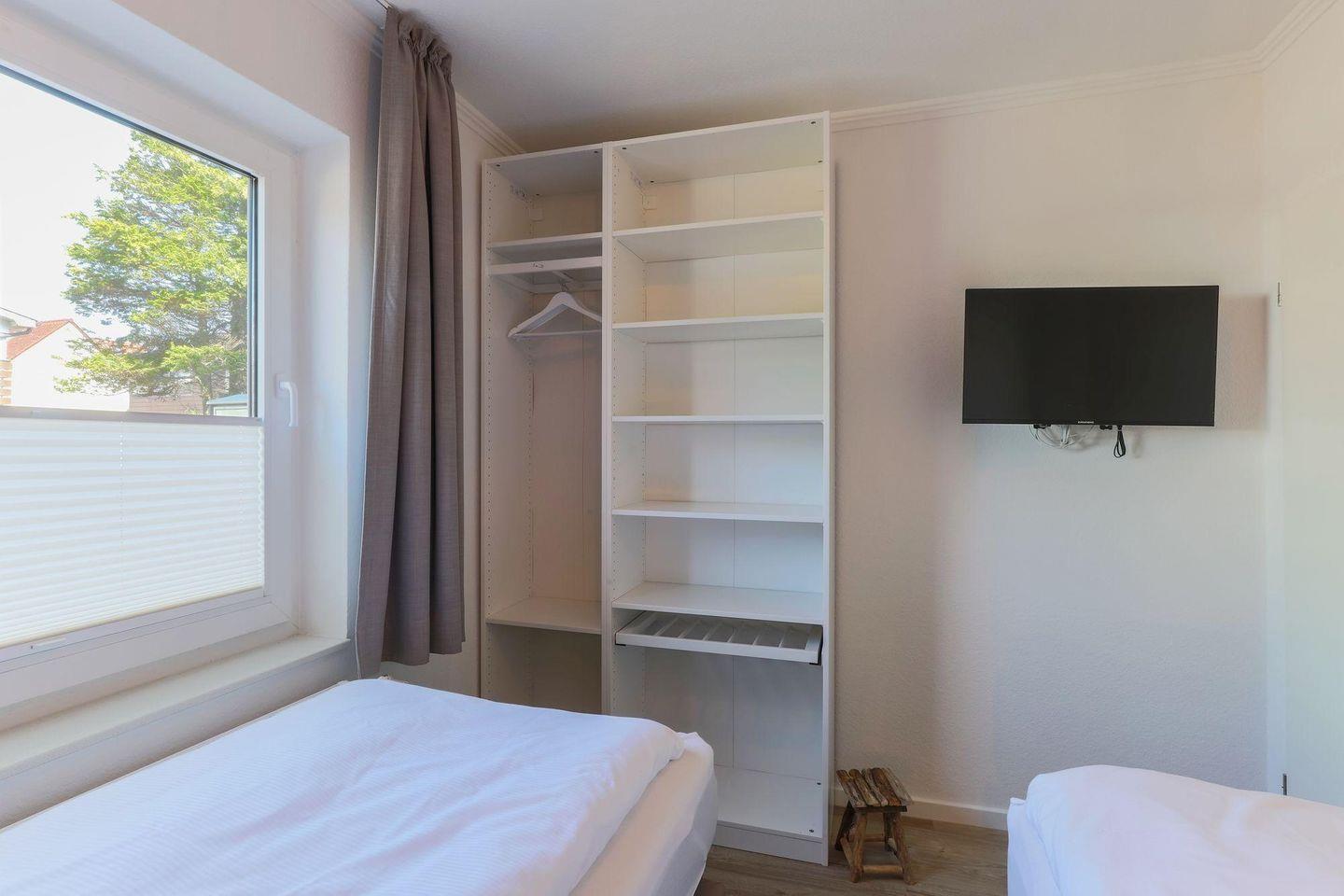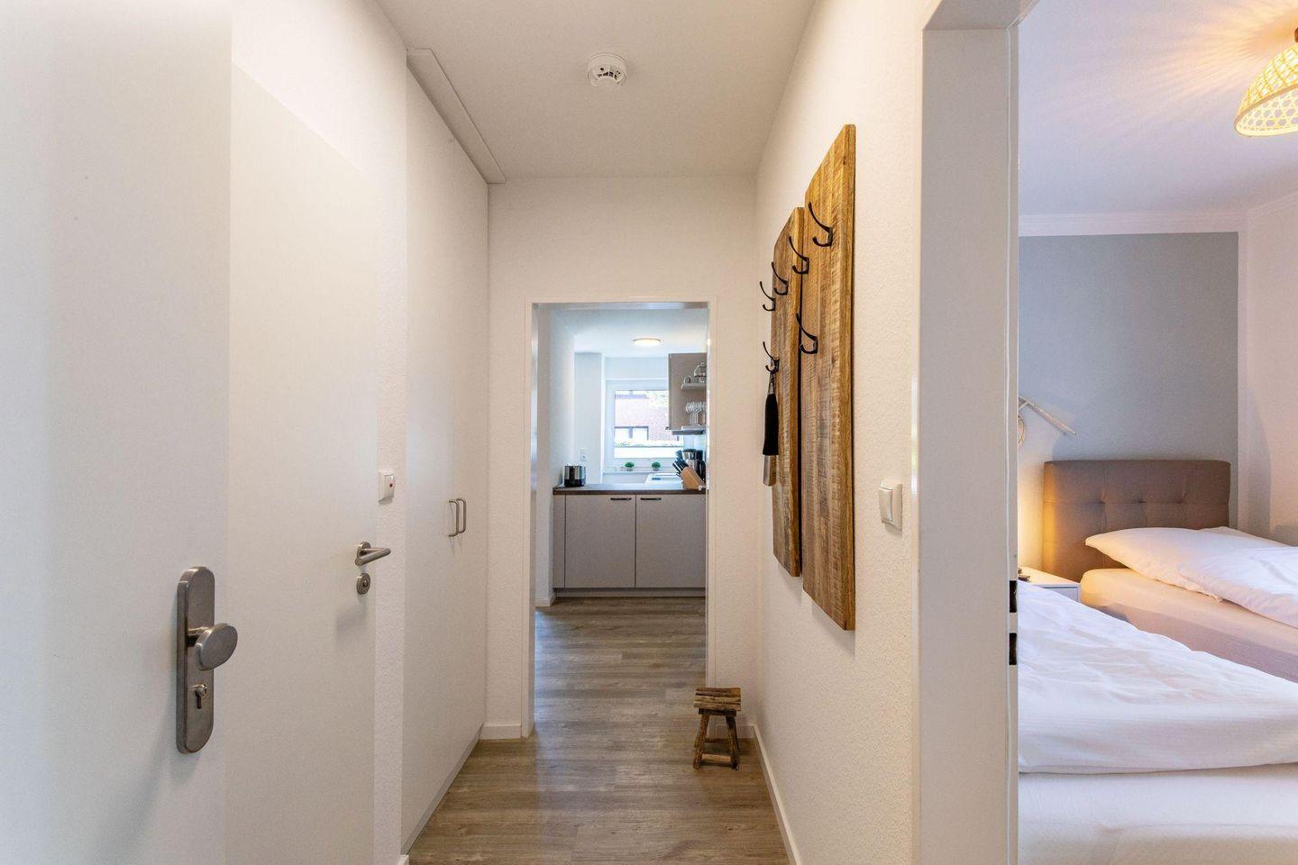 Ein heller Flur empfängt Sie mit einer modernen Garderobe und Zugängen zu sämtlichen Zimmern. Die Ferienwohnung bietet mit 2 Schlafzimmern Platz für 4 Personen. Eines der zwei Schlafzimmer ist mit einem hochwertigen Doppel-Boxspringbett (180 x 200) und ein weiteres mit zwei Einzelboxspringbetten (je 90 x 200) ausgestattet. Alle Betten verfügen über Bettkästen, sodass Sie Ihre Koffer für die Urlaubszeit verstauen können. In beiden Schlafzimmern befinden sich wandhängende TV-Flatscreens für den individuellen Fernsehgenuss.