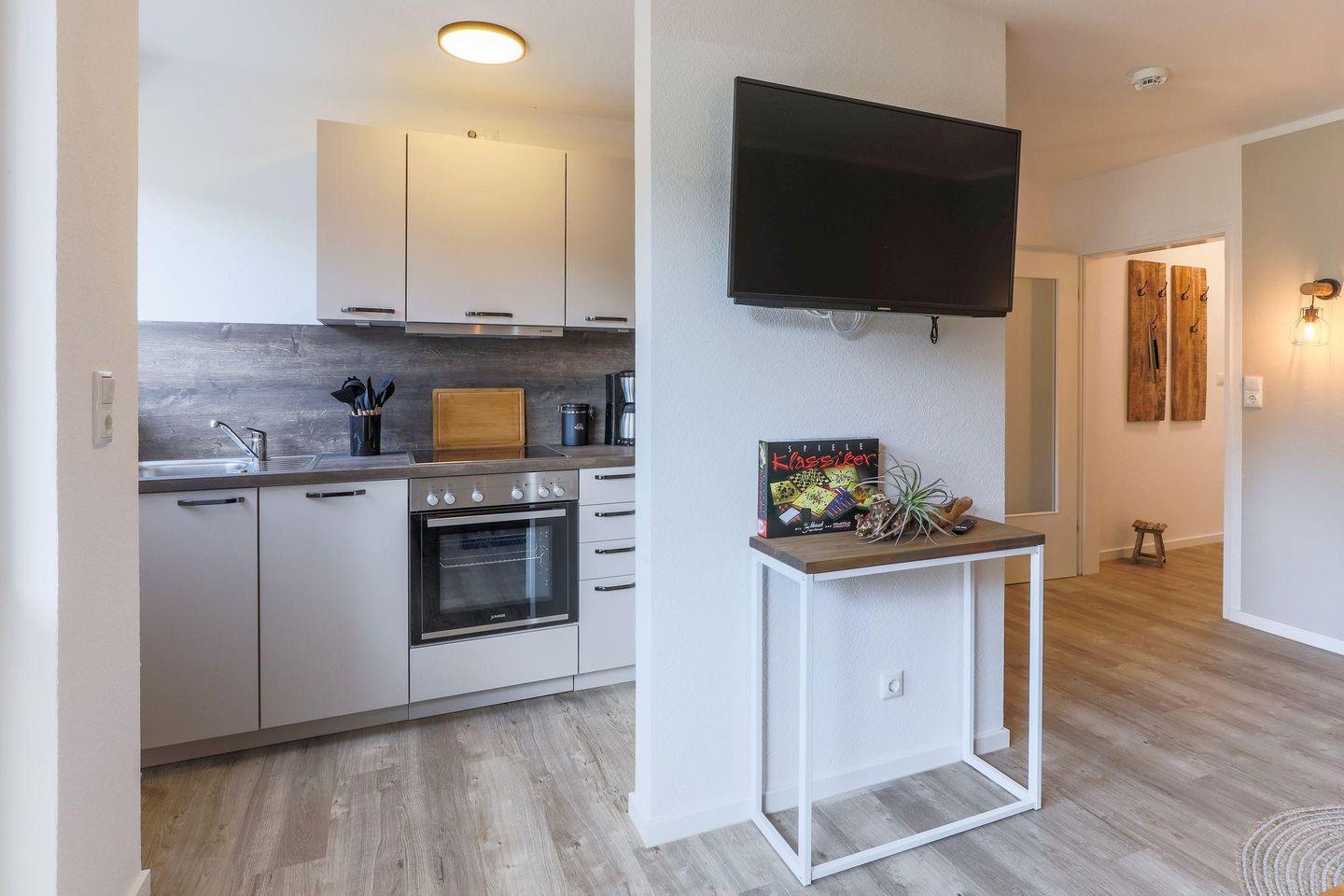 Ein modernes Bad bietet eine komfortable Dusche mit niedrigem Einstieg sowie eine Handtuchheizung. Das Herzstück der Wohnung ist das gemütliche Wohnzimmer mit einer hochwertigen, offenen Küche. Hier finden Sie eine Spülmaschine, ein Cerankochfeld, eine Filterkaffeemaschine und einen Kühlschrank, der mit einem Gefrierfach ausgestattet ist. Ein schöner Essbereich, eine kuschelige Couchgarnitur und ein großer TV-Flatscreen vervollständigen den Wohn-und Küchenbereich. Von dem Wohnbereich gelangen Sie auf einen großzügigen, sonnigen Süd-Westbalkon, ausgestattet mit hochwertigen Balkonmöbeln. Hier können Sie bei einem Glas Wein entspannte Abende mit Ihren Liebsten genießen.