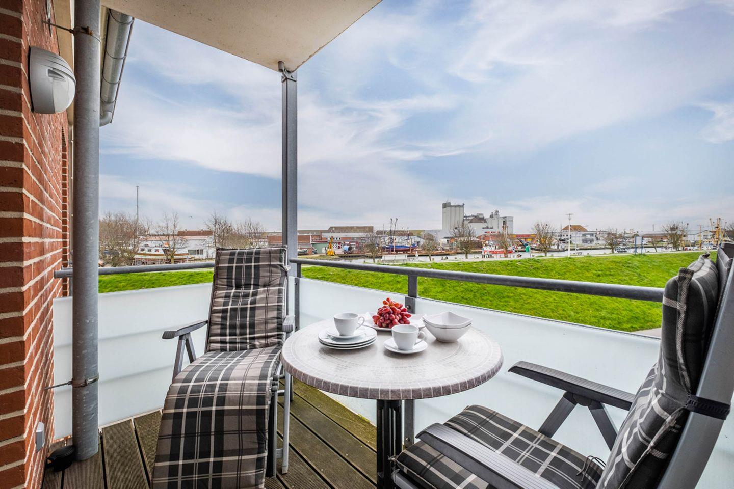 Das Appartement 2.3 mit Balkon liegt im zweiten Obergeschoss des Hauses Hafenresidenz. Im Wohnzimmer finden Sie eine gemütliche Couchgarnitur mit einen Fernsehsessel vor. Die Küche und der Essbereich sind im Wohnbereich integriert. Das Schlafzimmer ist mit einen Doppelbett und TV-Wandmontage ausgestattet. Die Lattenroste des Bettes sind elektrisch verstellbar. Das geräumige Duschbad verfügt über einen Handtuchtrockner, Haltegriffe am WC und in der Dusche. Die Dusche hat eine kleine Einstiegskante. Fußbodenheizung im ganzen Appartement. Vom Wohnzimmer gelangen Sie auf den Balkon, der in Südwestlage liegt. Das Appartement verfügt über elektrische Außenjalousien und über eine Gegensprechanlage mit Kamera. Im Erdgeschoß des Hauses finden Sie Waschmaschine und Trockner (gebührenpflichtig) und einen Abstellraum für Fahrräder. Das Haus verfügt über einen Aufzug.