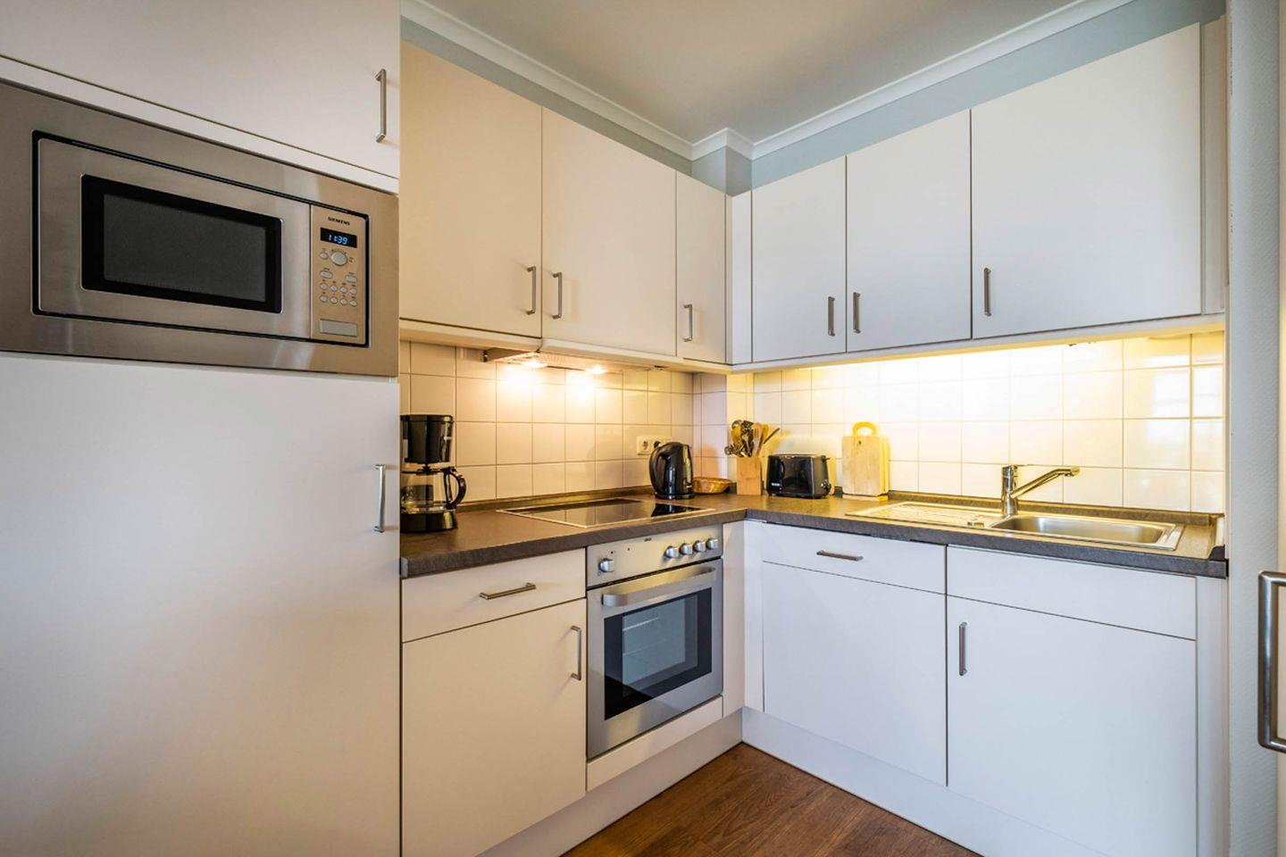 Küche: Backofen, Herd mit Cerankochfeld, Mikrowelle, Geschirrspüler, Kühlschrank mit Gefrierfach
