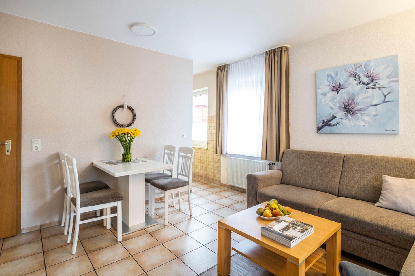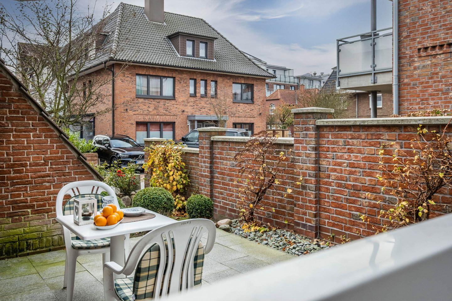 Die Ferienwohnung 1 liegt im Erdgeschoss und verfügt über eine Terrasse in West-Lage.