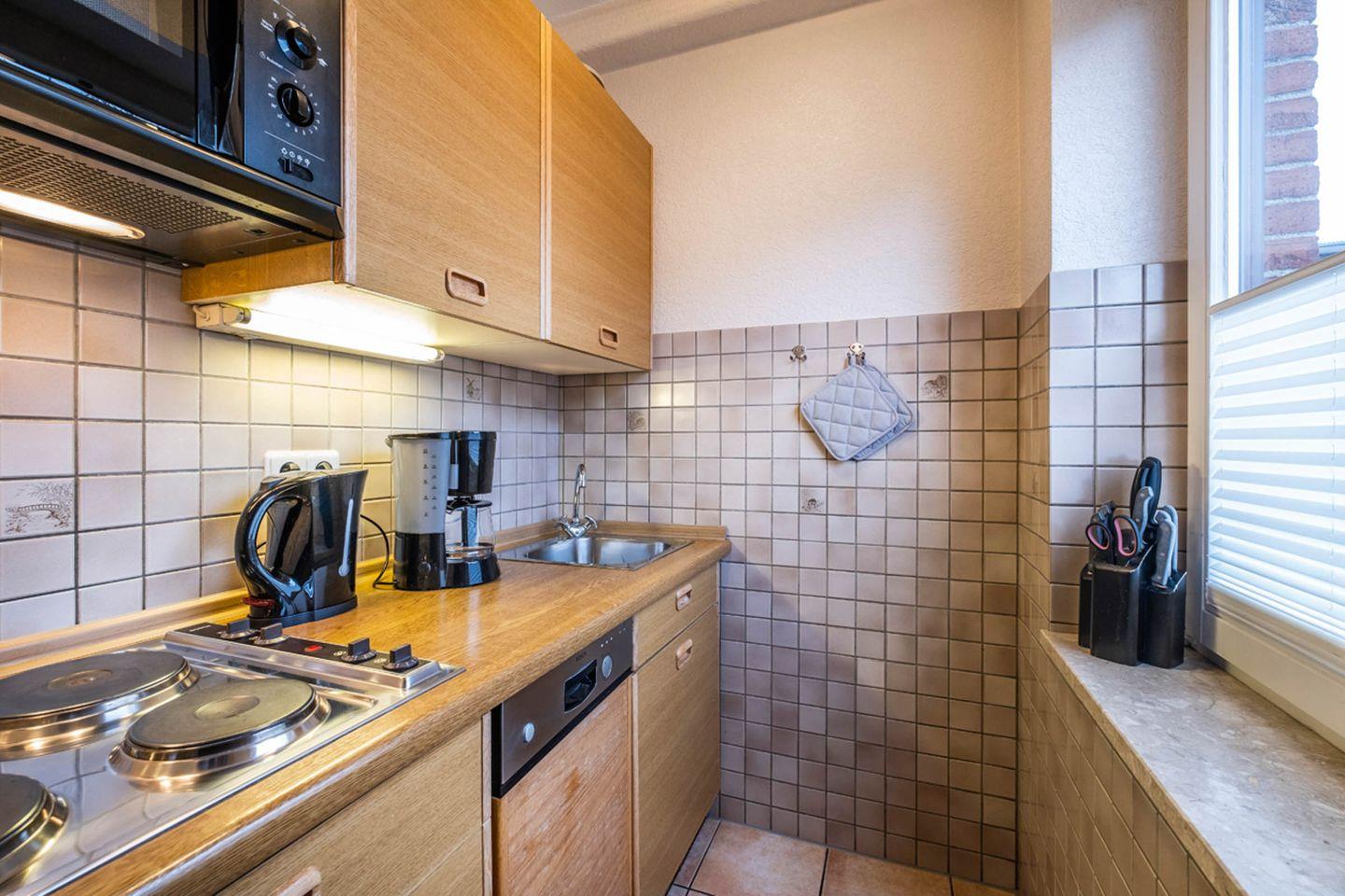 Küchenzeile: Geschirrspüler, Kochfeld, Mikrowelle, Kühlschrank mit Gefrierfunktion, Heißwasserkocher, Kaffeemaschine, Toaster.