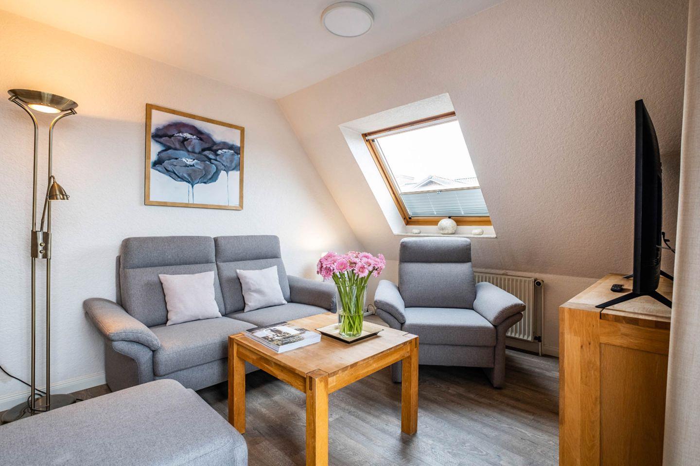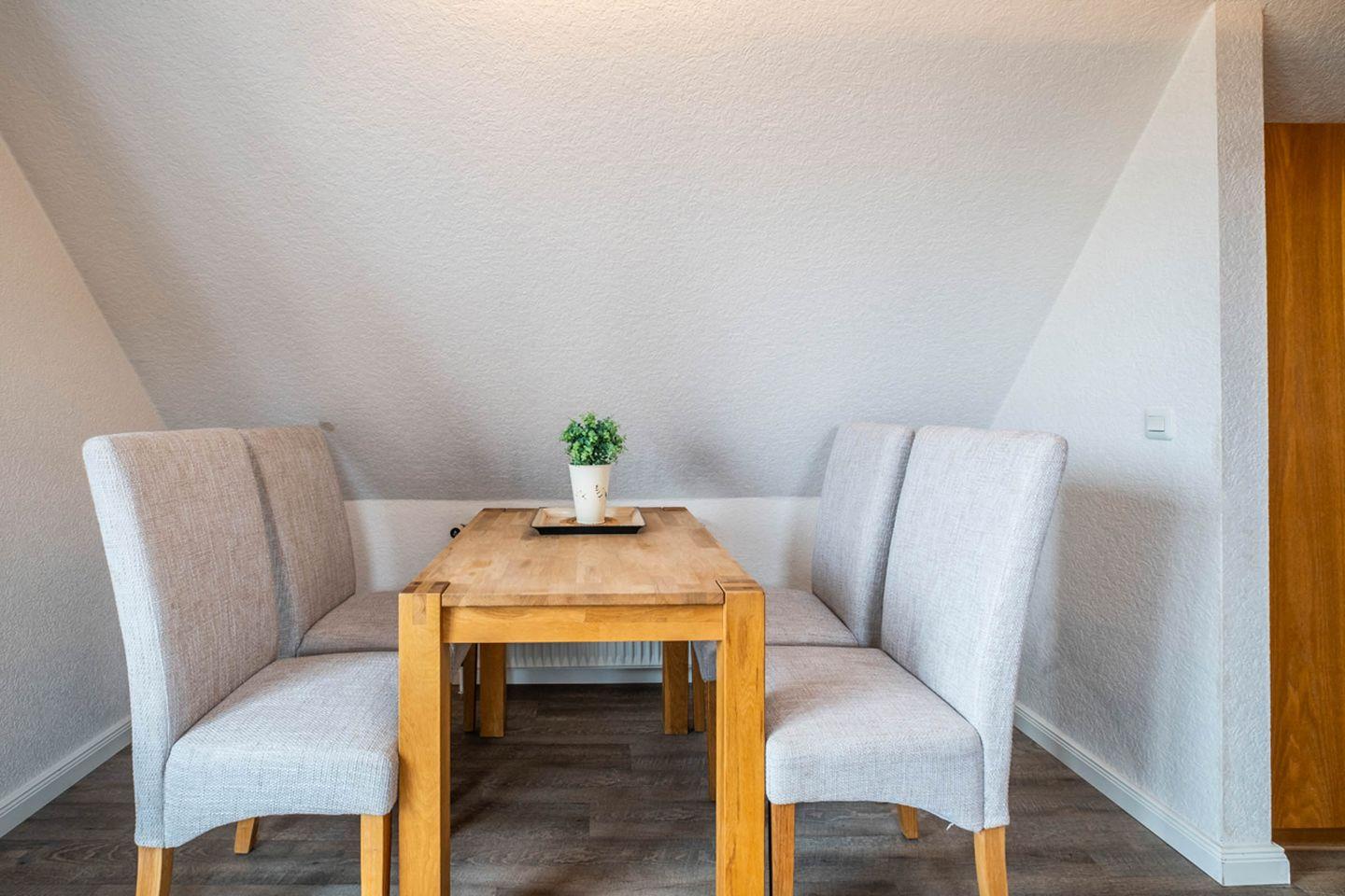 Die Ferienwohnung 8 liegt im Dachgeschoss und verfügt über einen Balkon in Süd-Ost-Lage. Es gibt leider keinen Aufzug im Haus.