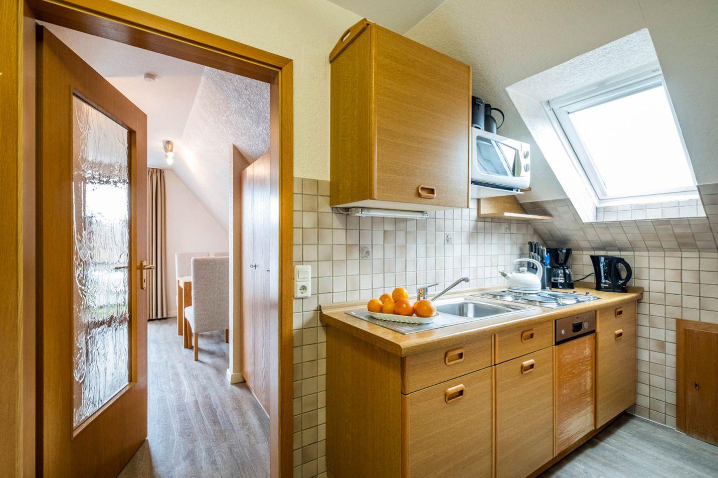 Küchenzeile: Geschirrspüler, Kochfeld, Mikrowelle, Kühlschrank mit Gefrierfunktion, Heißwasserkocher, Kaffeemaschine, Toaster.