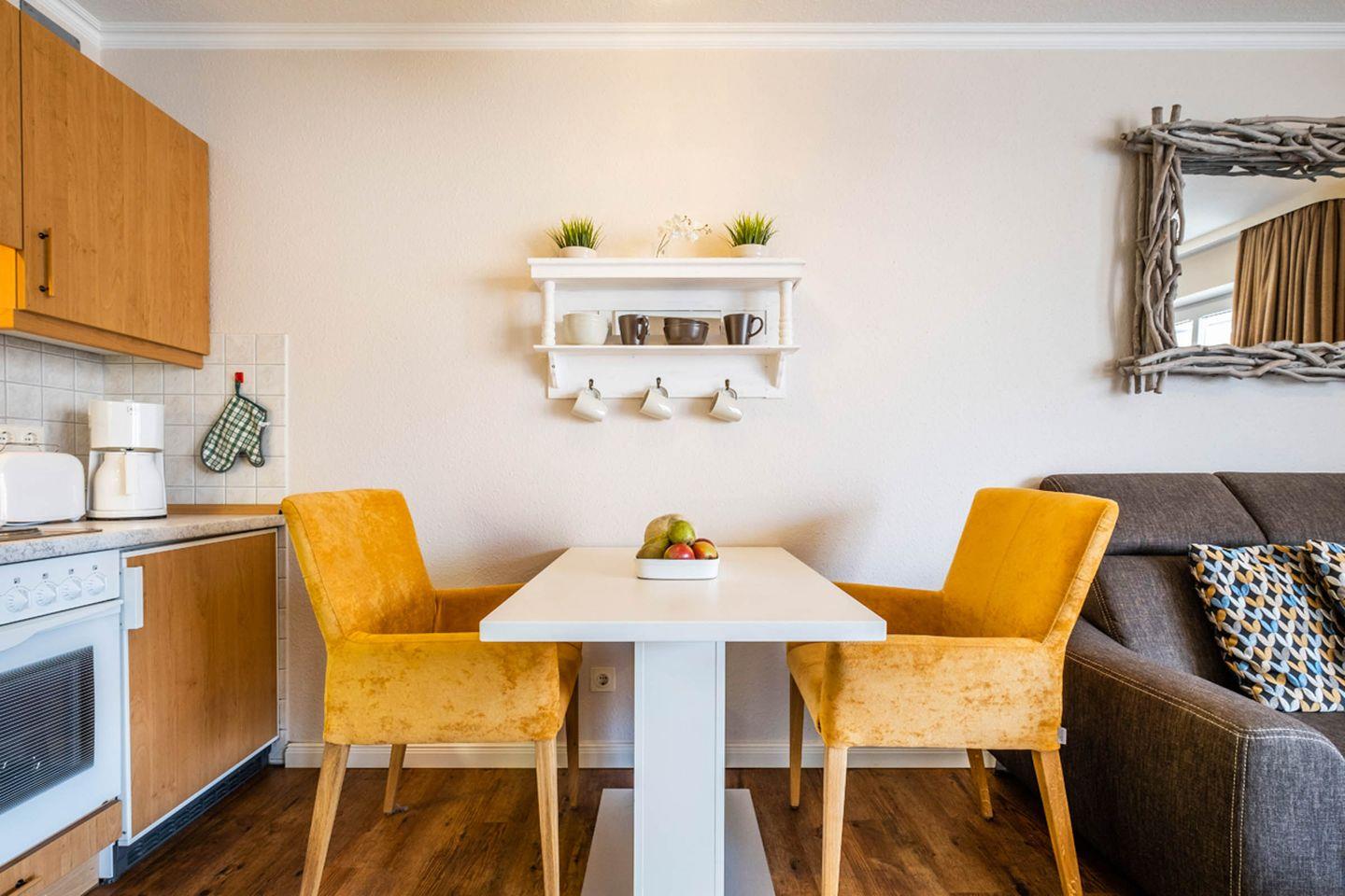 1 Wohnzimmer mit Essbereich, eine kleine Küchenzeile, 1 Schlafzimmer und 1 Duschbad.
