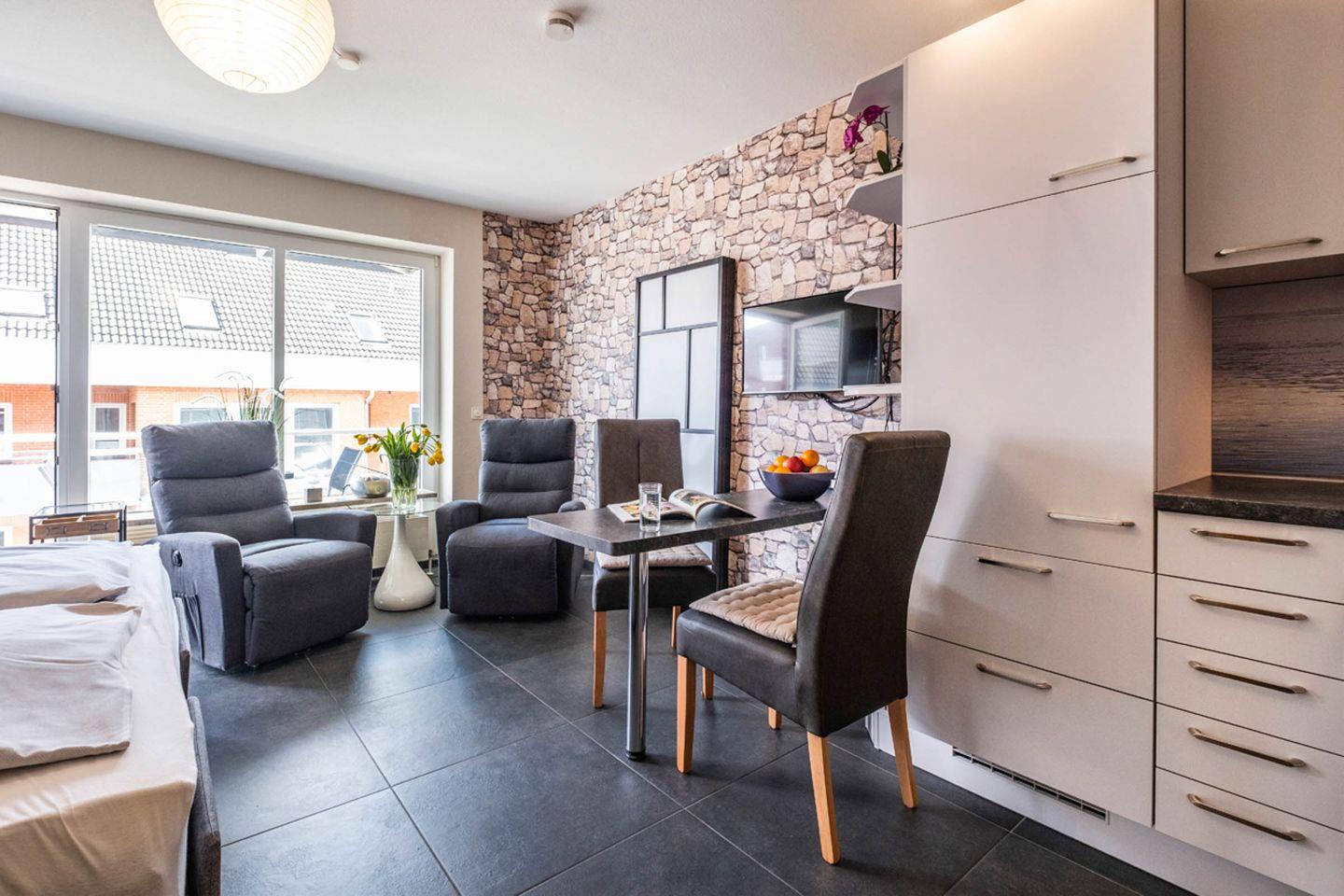 1 Wohn / Schlafzimmer kombiniert mit Essbereich und einer kleine Küchenzeile. 1 separates Duschbad. Das Bad verfügt über eine Dusche/WC. Vom Wohnbereich gelangen Sie auf den Balkon. Das Wohn / Schlafzimmer verfügt über ein Boxspringbett, 1,80 x 2,00m(mit elektrisch verstellbarem Lattenrost) und 2 TV Ruhesessel mit manueller Verstellung von Fuß- und Rückenteil.