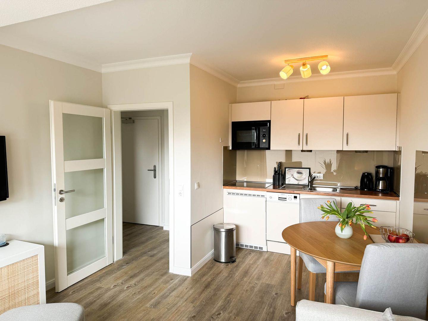 Küchenzeile: Geschirrspüler, Kochfeld, Mikrowelle, Kühlschrank mit Gefrierfunktion, Heißwasserkocher, Kaffeemaschine, Toaster.