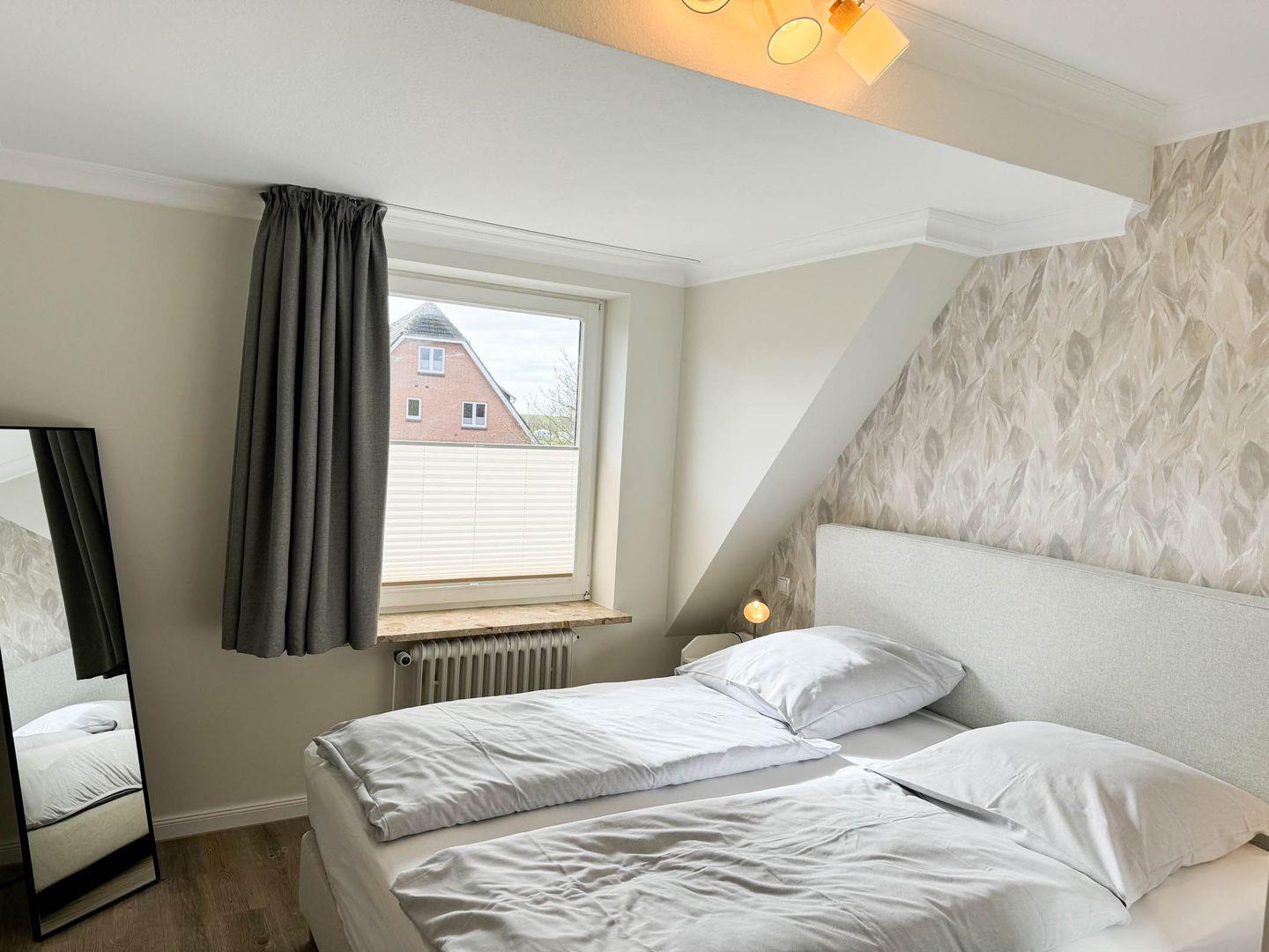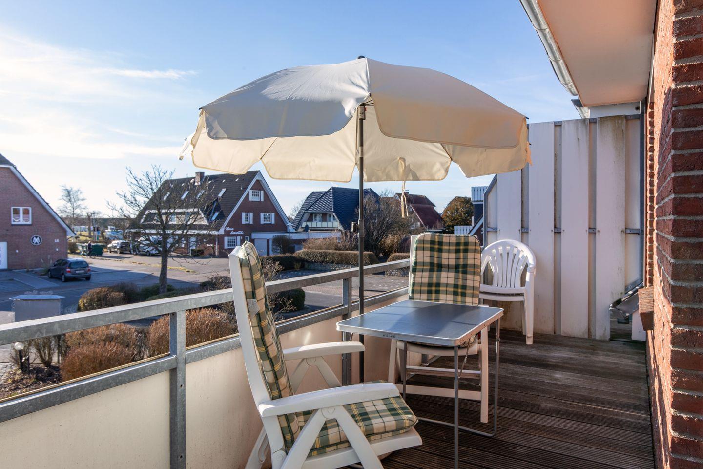Die Ferienwohnung 5 (33 qm) liegt im 1. Obergeschoss und verfügt über einen Balkon in West-Lage. Es gibt leider keinen Aufzug im Haus.