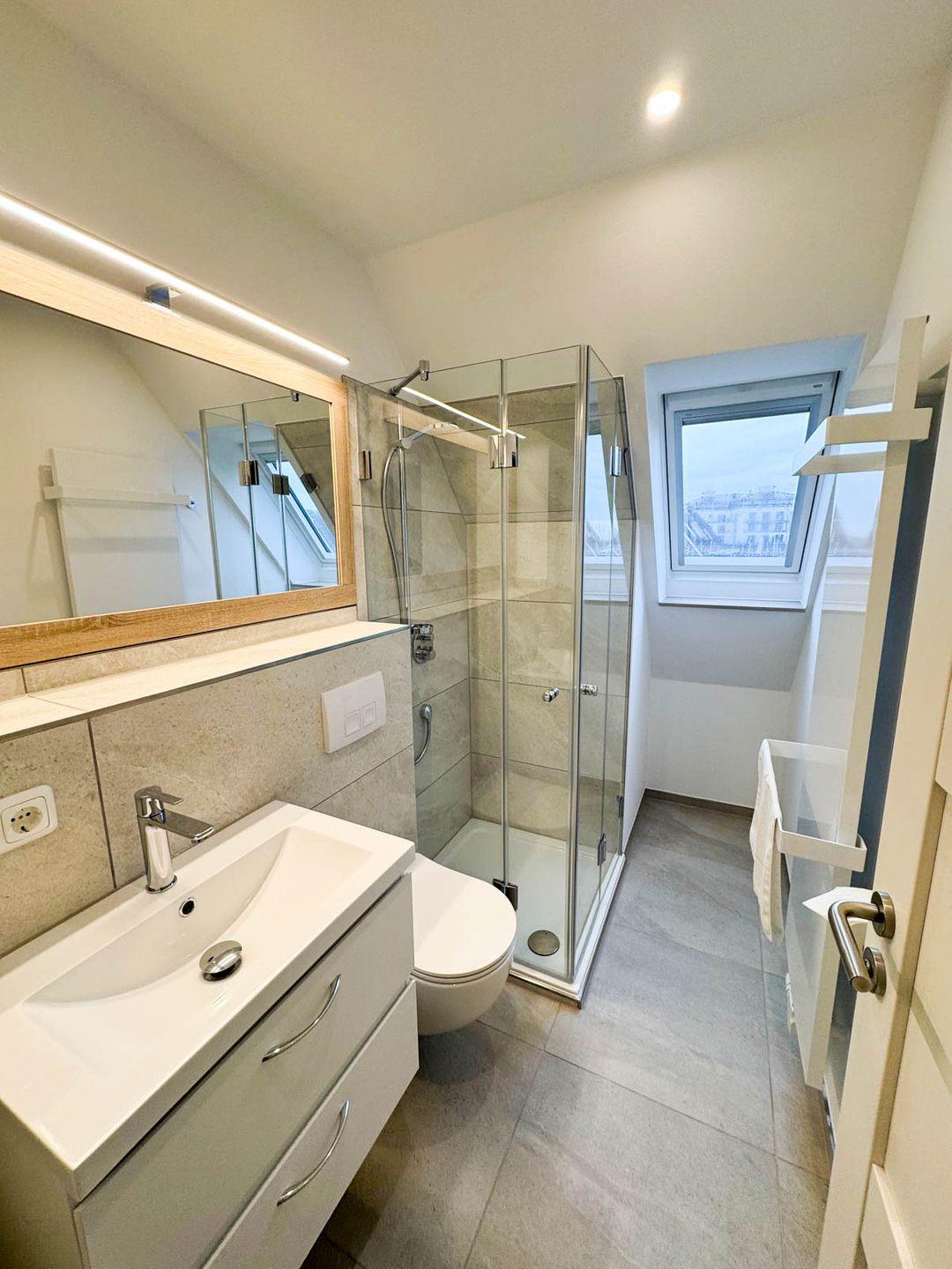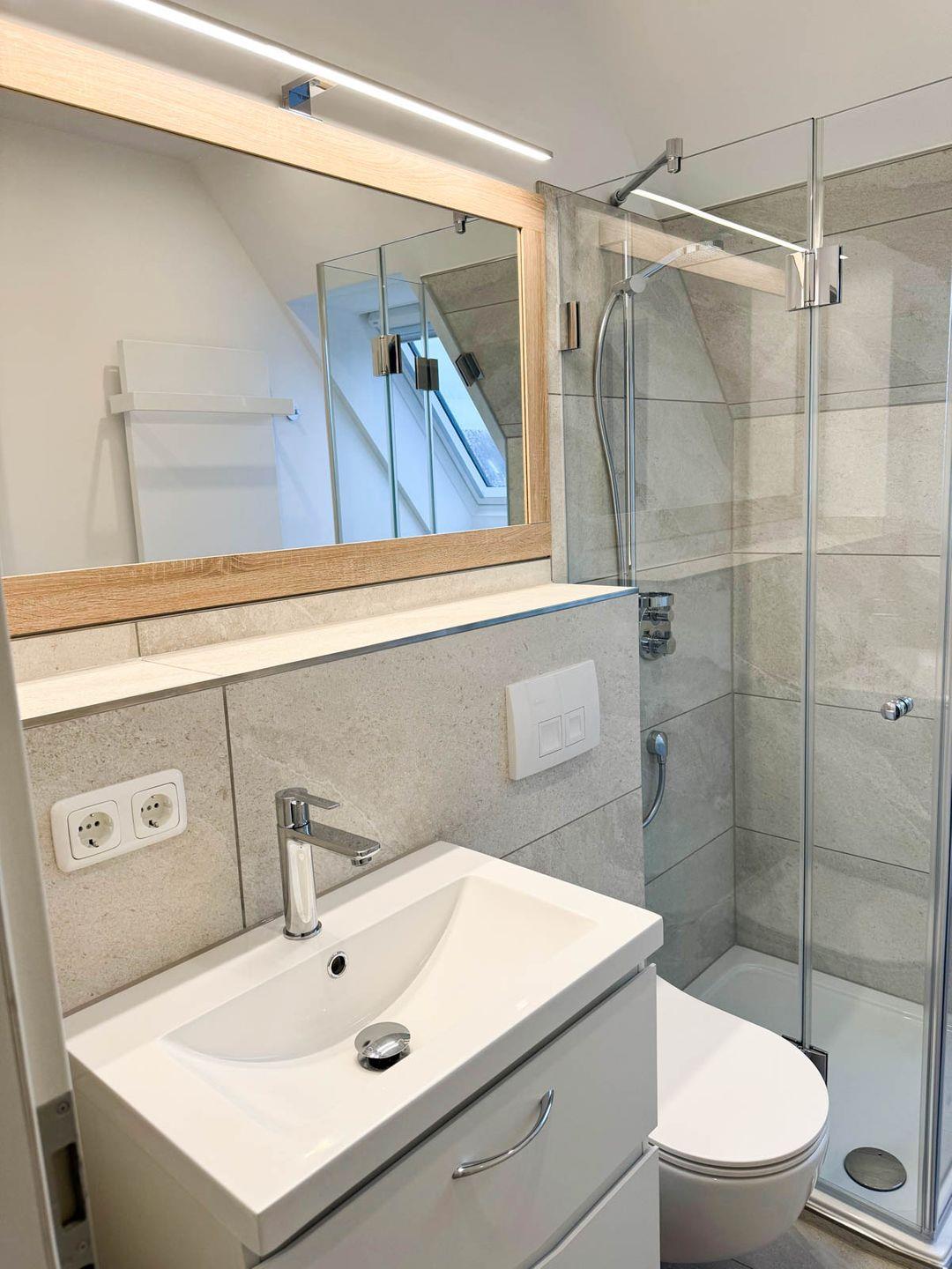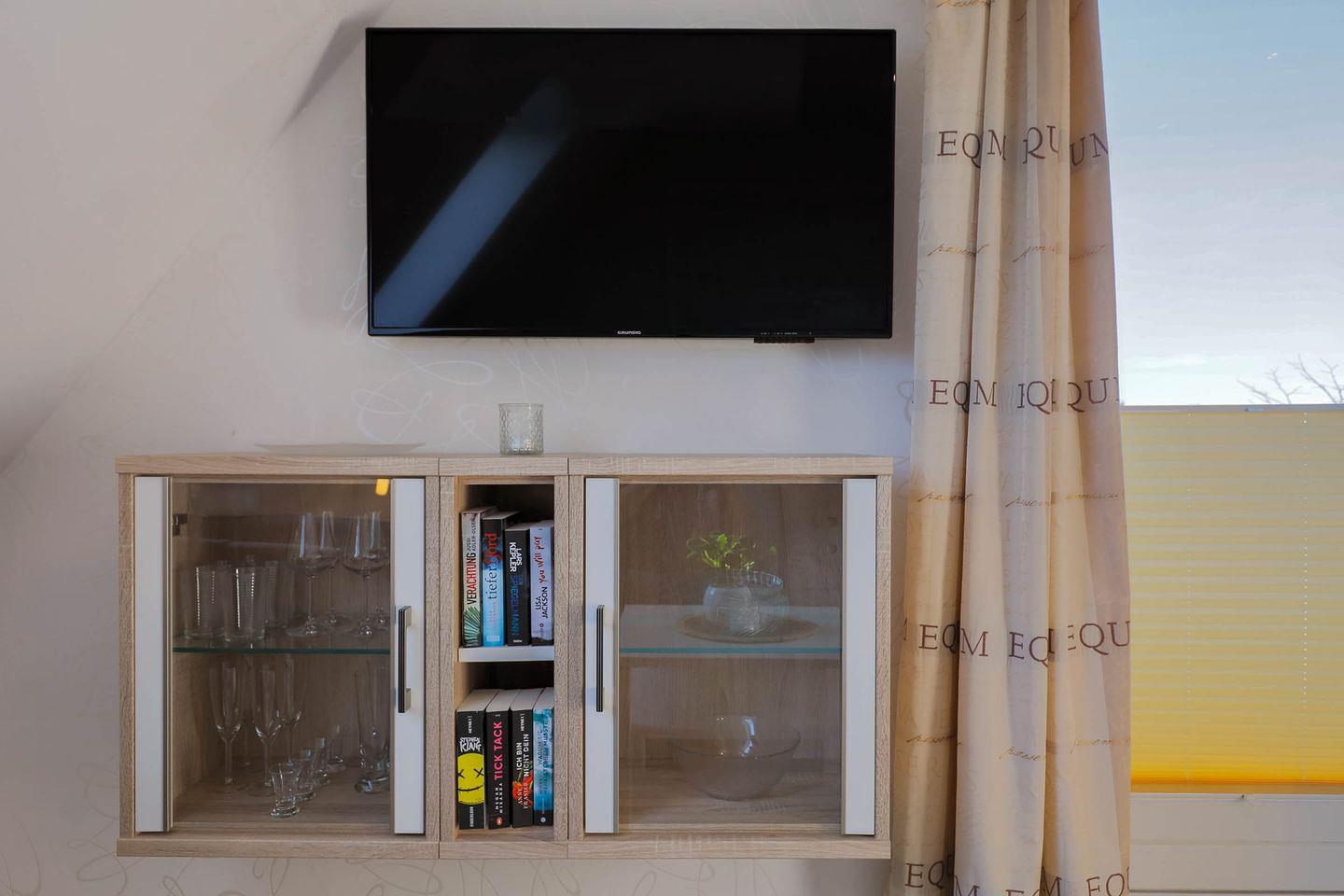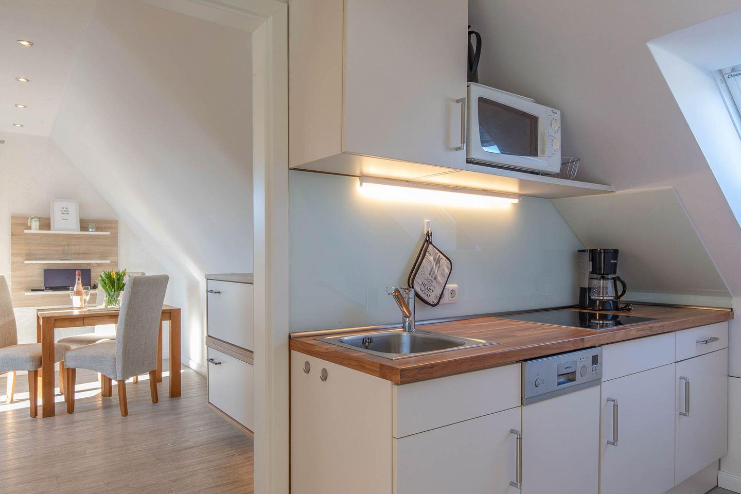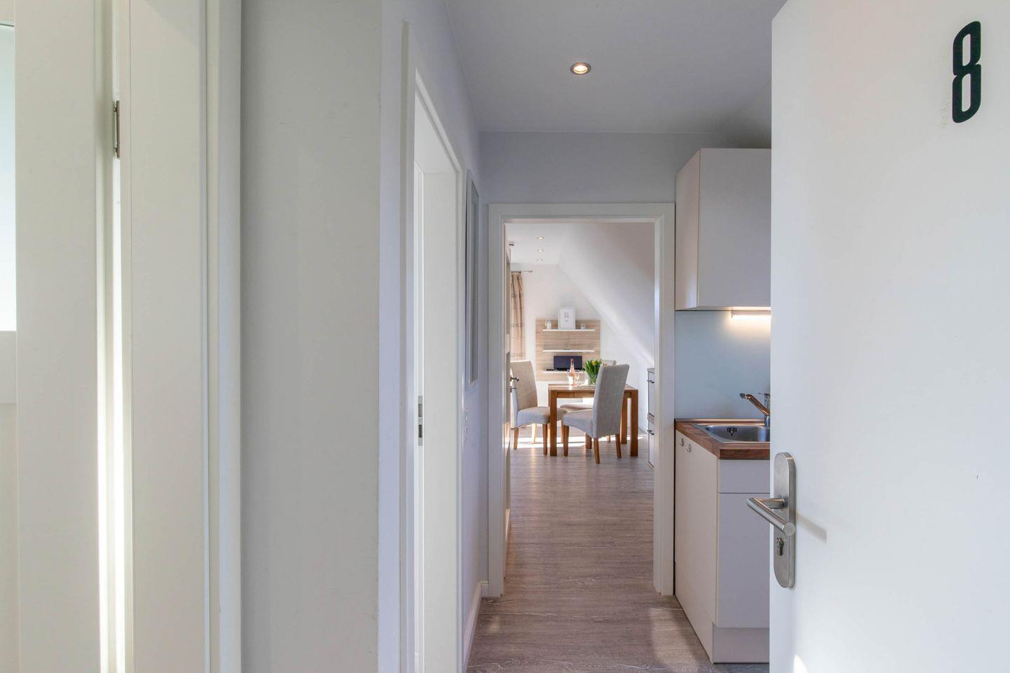 Die Ferienwohnung 8 (33 qm) liegt im Dachgeschoss und verfügt über einen Balkon (zur Straße Föhrer Weg). Es gibt leider keinen Aufzug im Haus.