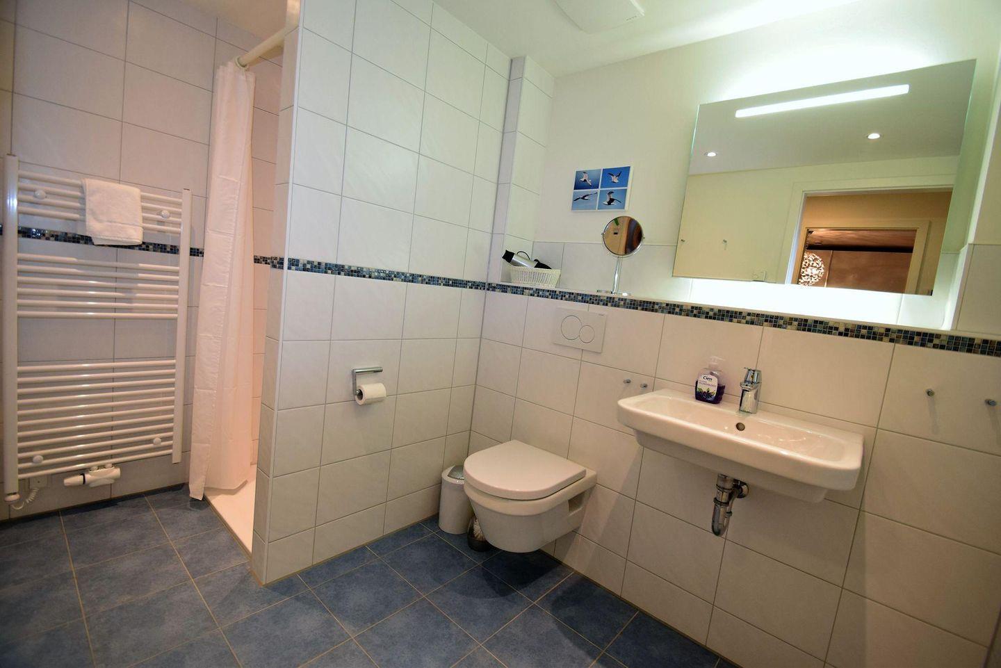 Sanitär: Duschbad mit ebenerdiger Dusche, Haar-Föhn, Kosmetikspiegel