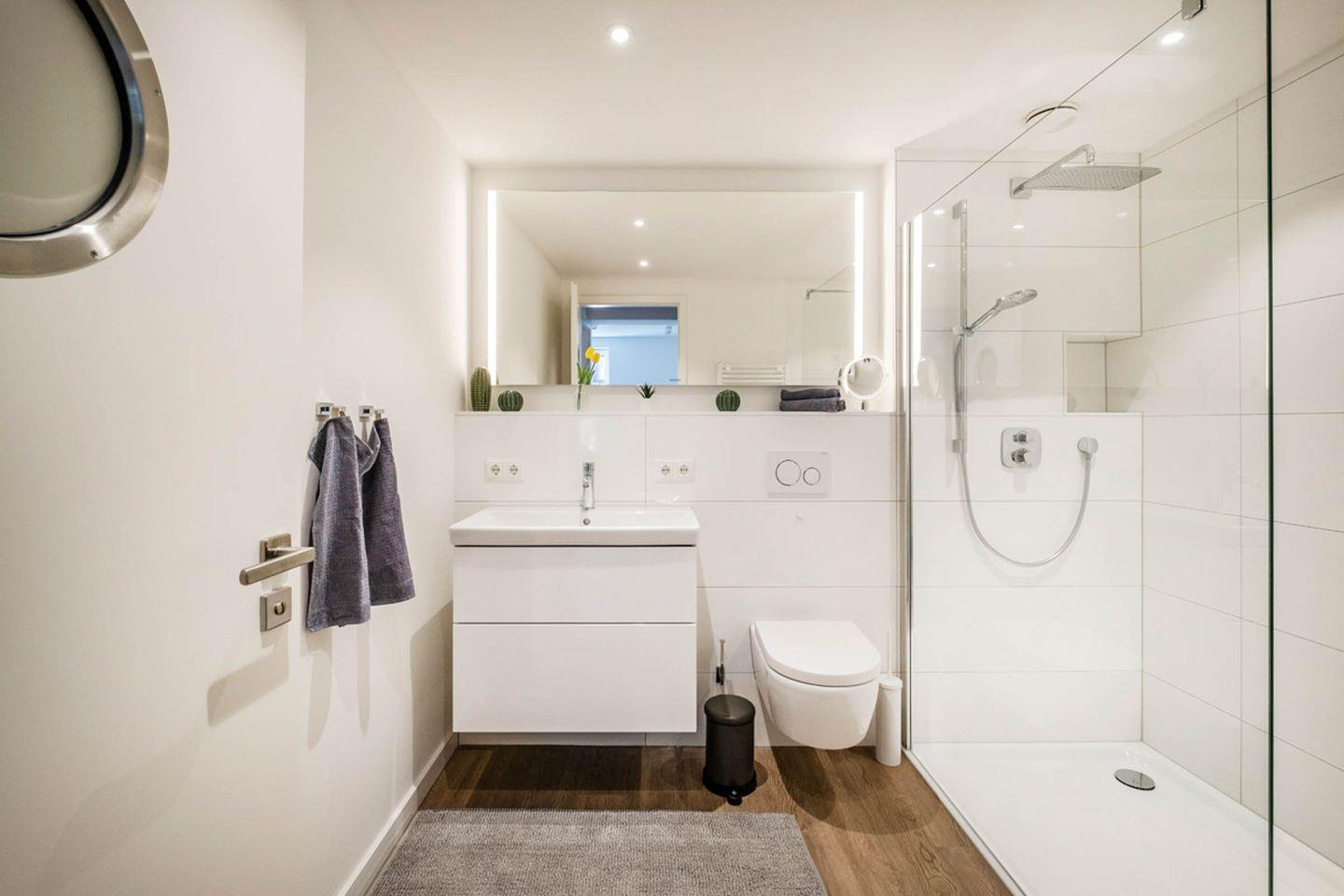 Badezimmer: Walk-In-Dusche mit Haltegriff, Handtuchheizung, Haar-Föhn, beheizbarer & beleuchteter Spiegel