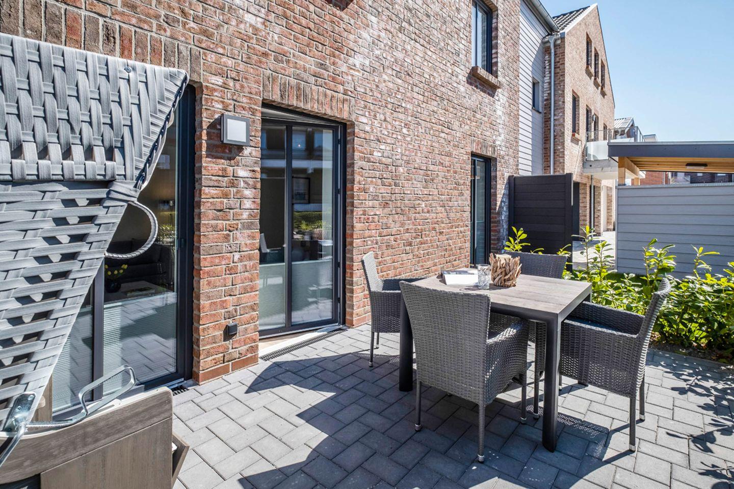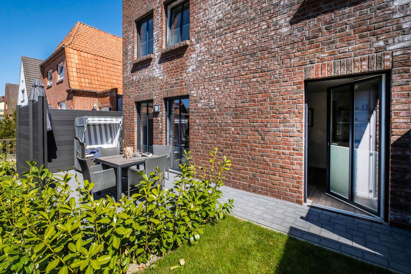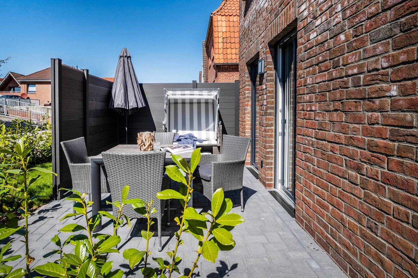 Die geschützte Terrasse verfügt über einen eigenen Strandkorb, einen Gartentisch und weitere Sitzgelegenheiten.