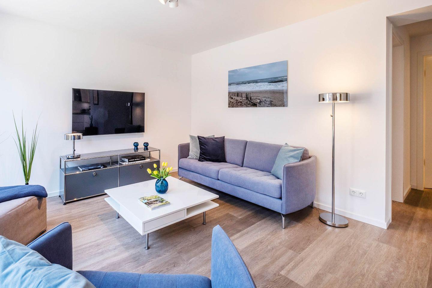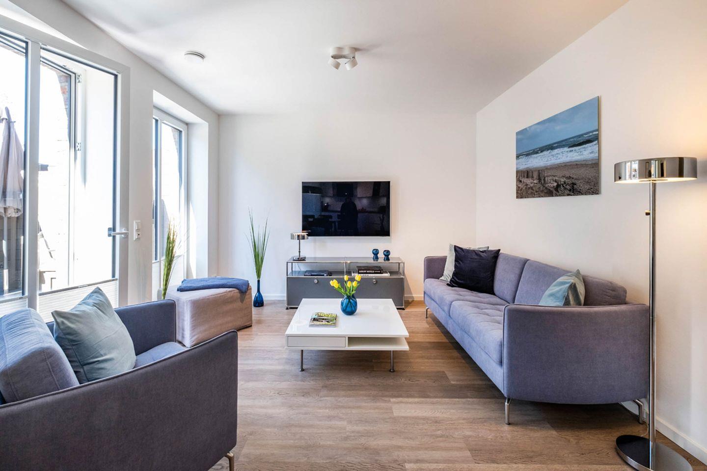 Das großzügige Wohnzimmer verfügt, wie auch das Schlafzimmer, über einen großen Smart-TV.