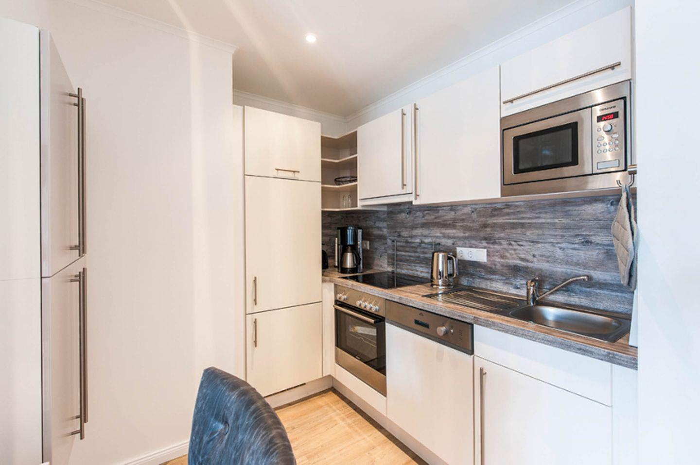 - Küche: Ceranfeld, Backofen, Mikrowelle, Geschirrspülmaschine, Toaster, Wasserkocher, Kaffeemaschine