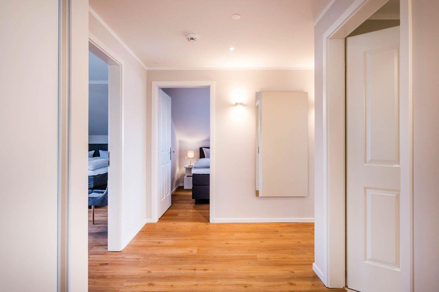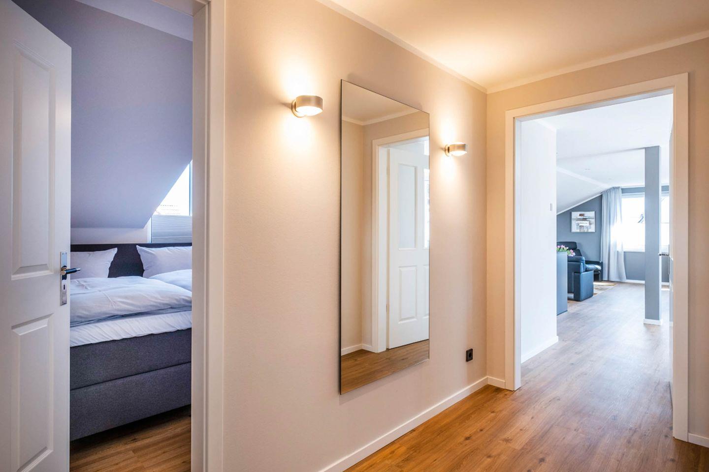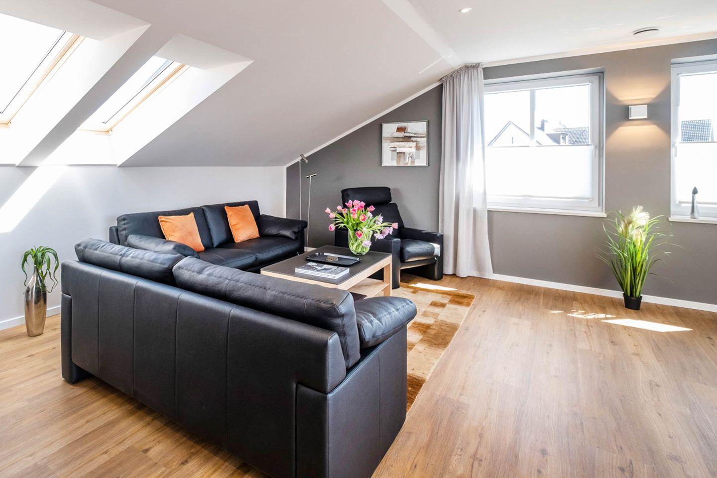 Dieses hochwertige, lichtdurchflutete Apartment bietet mit 2 Schlafzimmern Platz für 4 Personen. Das Wohnzimmer ist mit 2 gemütlichen Sofas sowie einem Fernsehsessel ausgestattet. Beide Schlafzimmer verfügen jeweils über ein hochwertiges Doppel-Boxspringbett. Des Weiteren verfügt das Apartment über einen Wohn- und Essbereich mit einer offenen Küche, die keine Wünsche offenlässt, und zwei großzügige Duschbäder.