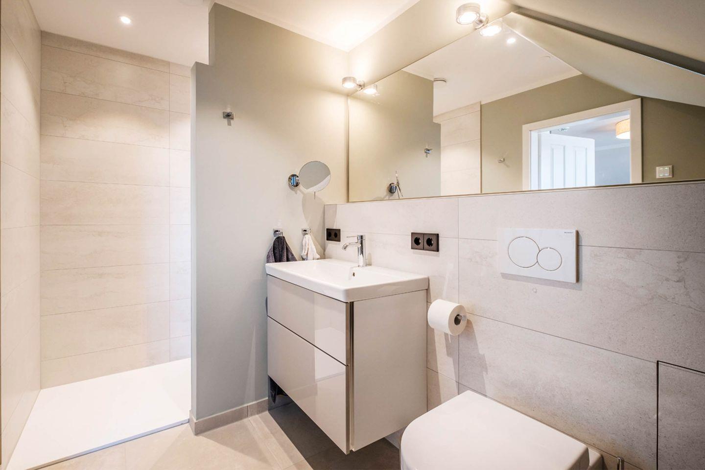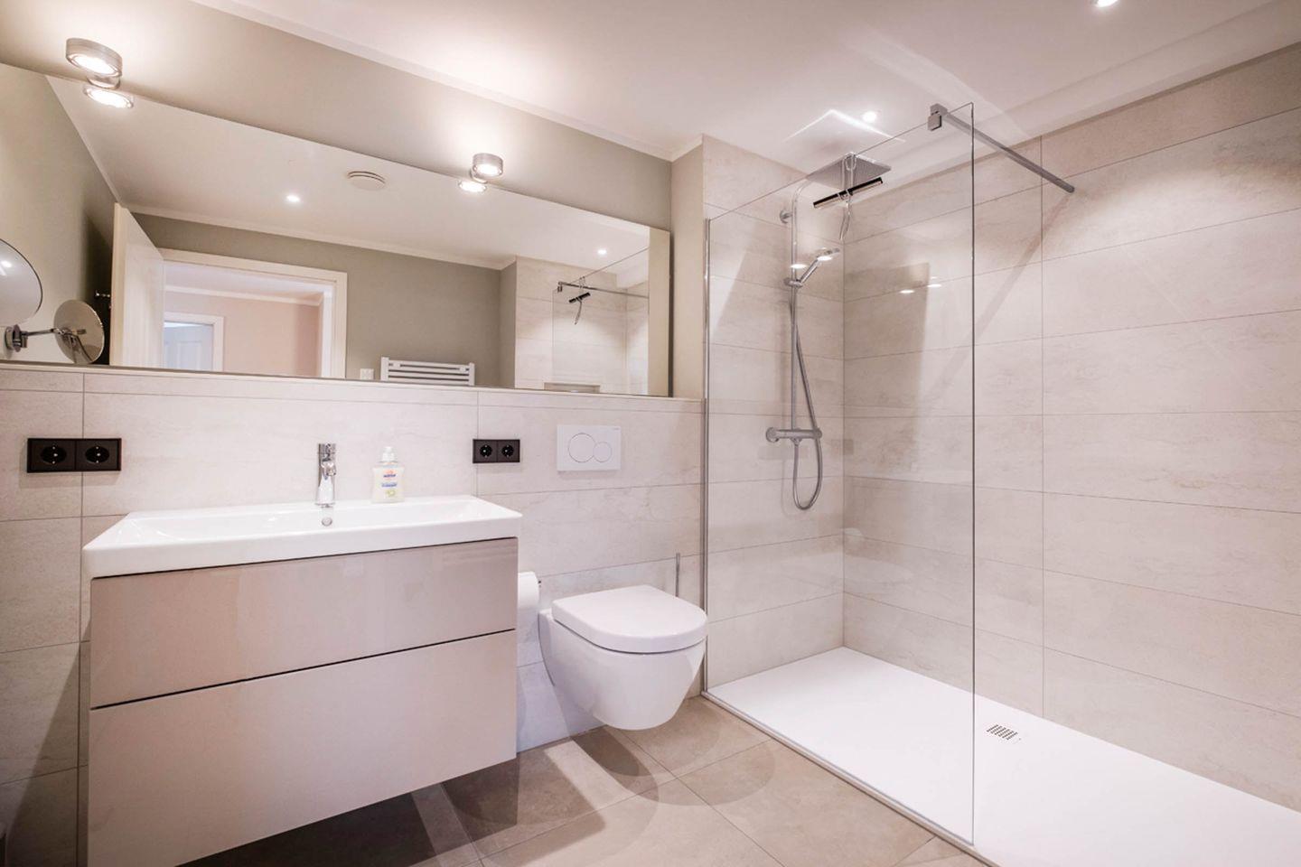 Badezimmer: Dusche, Handtuchheizung, Haar-Föhn, Kosmetikspiegel