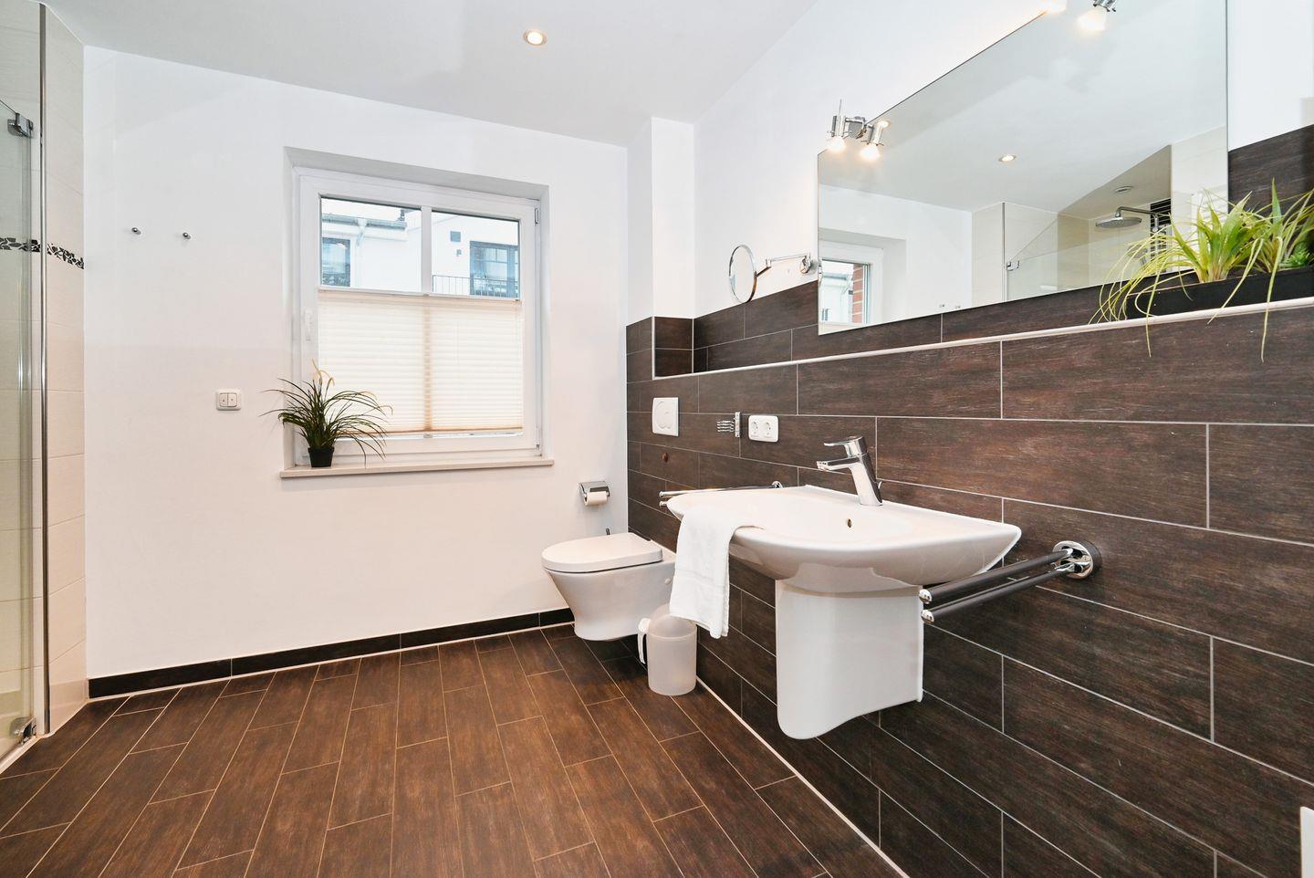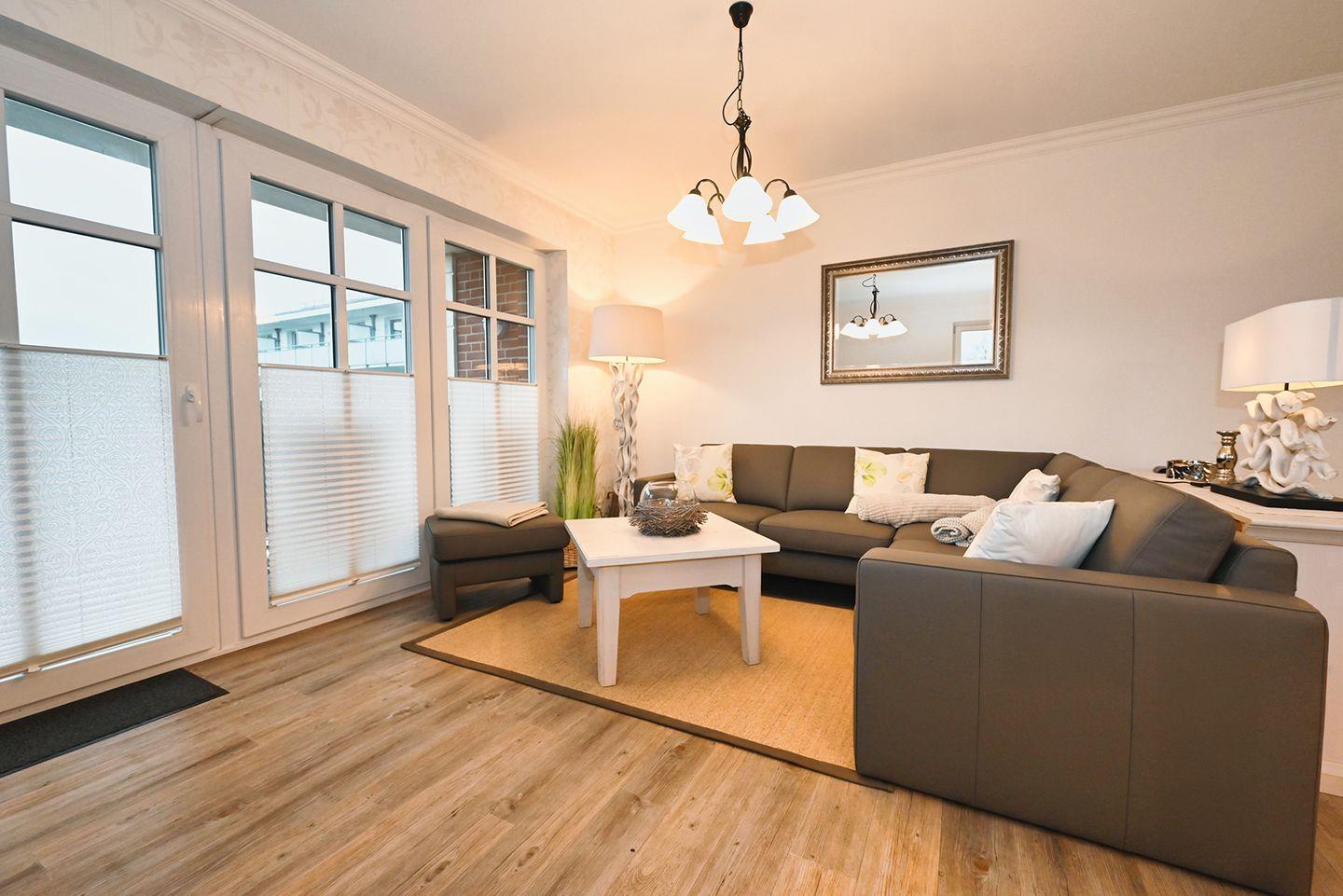 Die großzügige Ferienwohnung mit kompletter Fussbodenheizung liegt in der 1. Etage, erreichbar mit dem Fahrstuhl, hat teilweise Hafenblick.