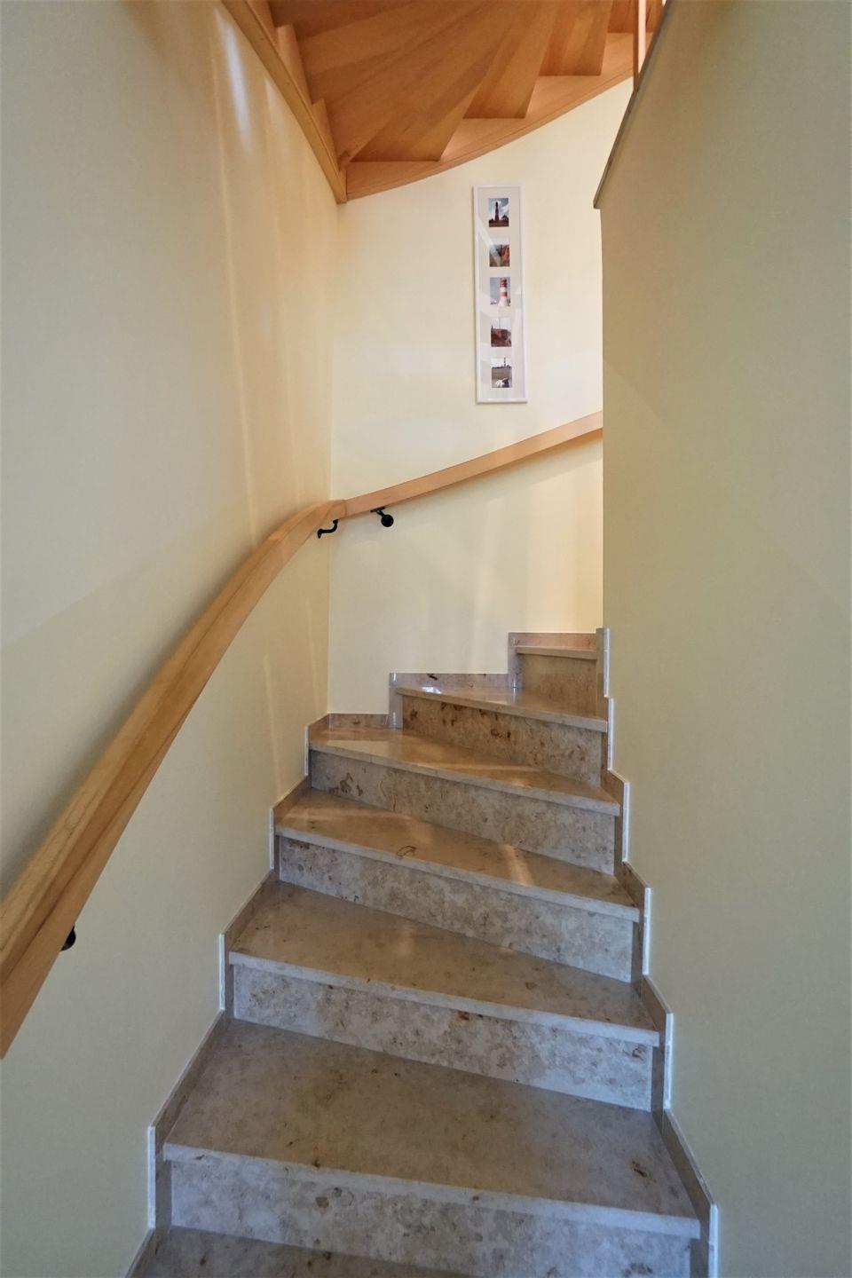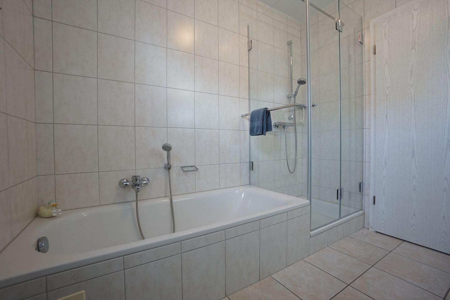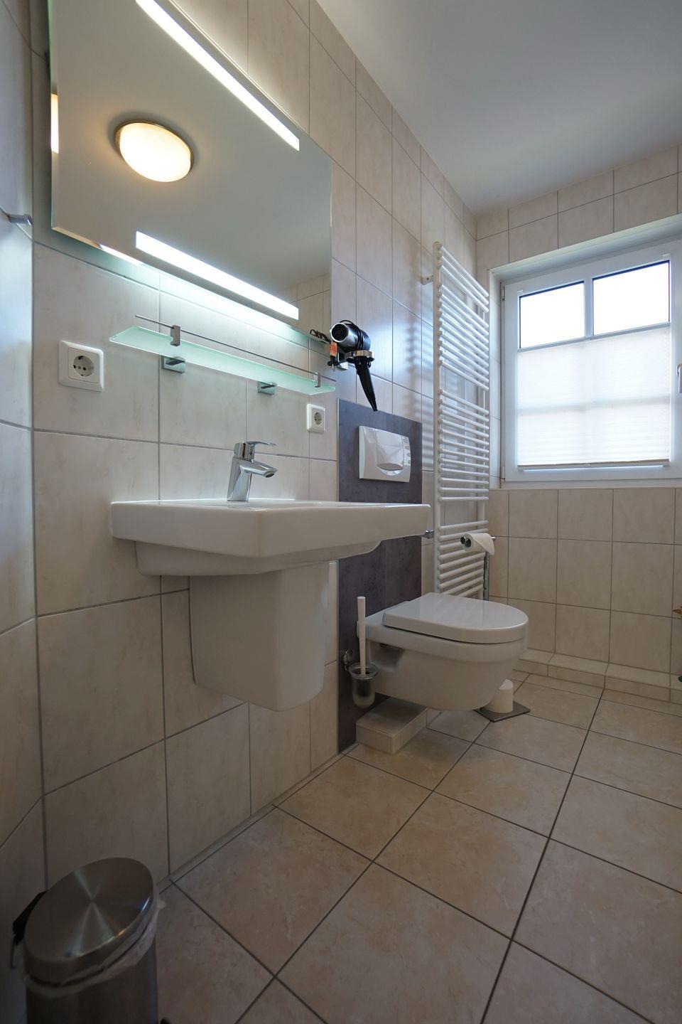 Die Unterkunft verfügt über ein Duschbad im Erdgeschoss und ein Dusch- und Wannenbad im ersten Obergeschoss. Beide Bäder besitzen eine Fußbodenheizung.