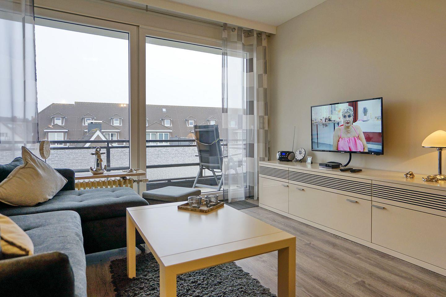 Im Wohnbereich befindet sich ein großer Flachbild-TV und der