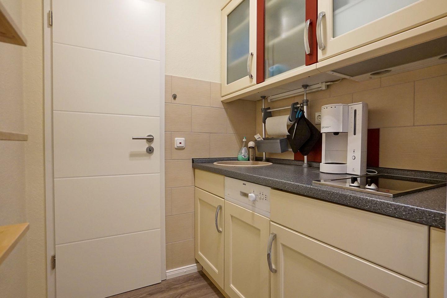 Küche ist ausgestattet mit einem zwei-Platten-Ceranfeld, einer Mikrowelle, einem Backofen, einem Geschirrspüler, einem Kühlschrank mit Gefrierfach und einer Tassimo