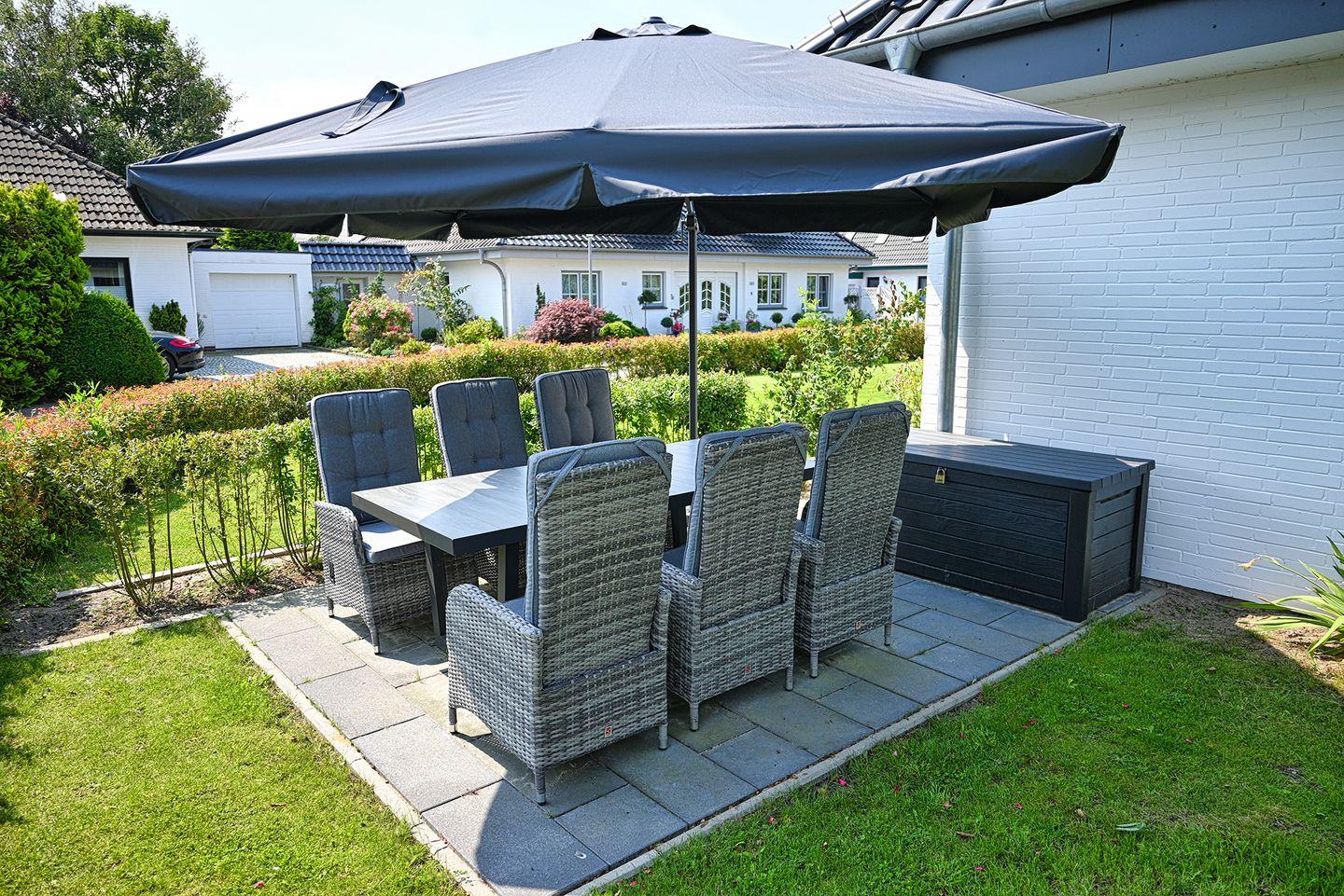 eigene Terrasse im Garten, die über einen kleinen Weg ums Haus zu erreichen ist.