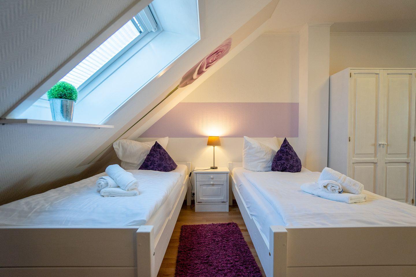 Über eine Treppe gelangen Sie ins zweite Schlafzimmer, das mit zwei Einzelbetten ausgestattet ist und über einen TV verfügt.