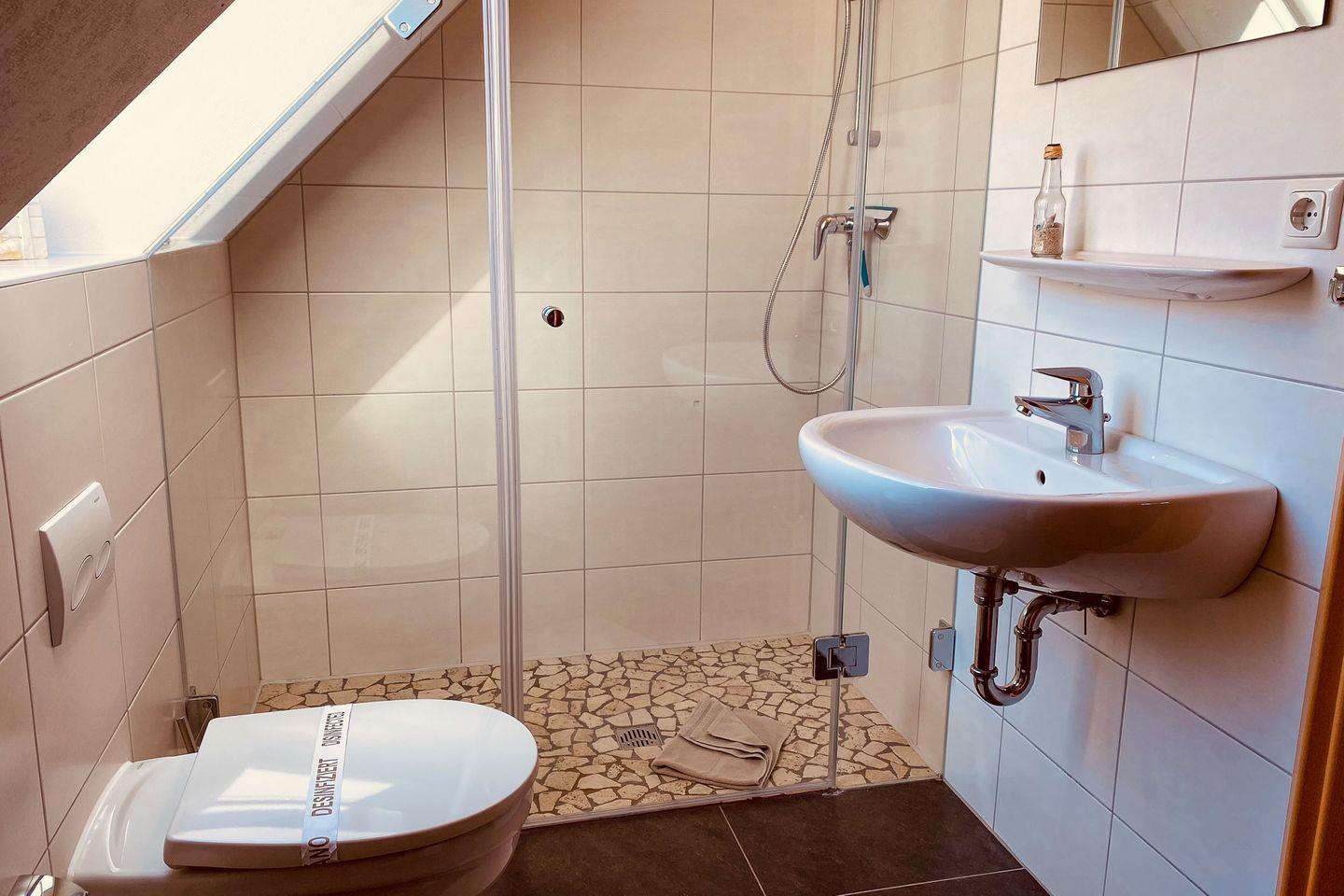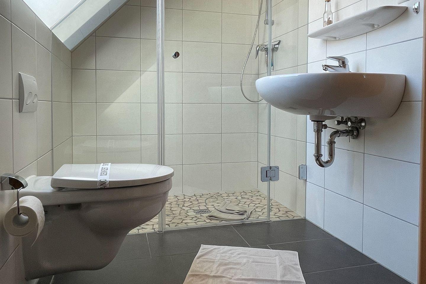 Das moderne Badezimmer ist mit einer bodengleichen Dusche und Fenster ausgestattet. Eine Waschmaschine bietet zusätzlichen Komfort.