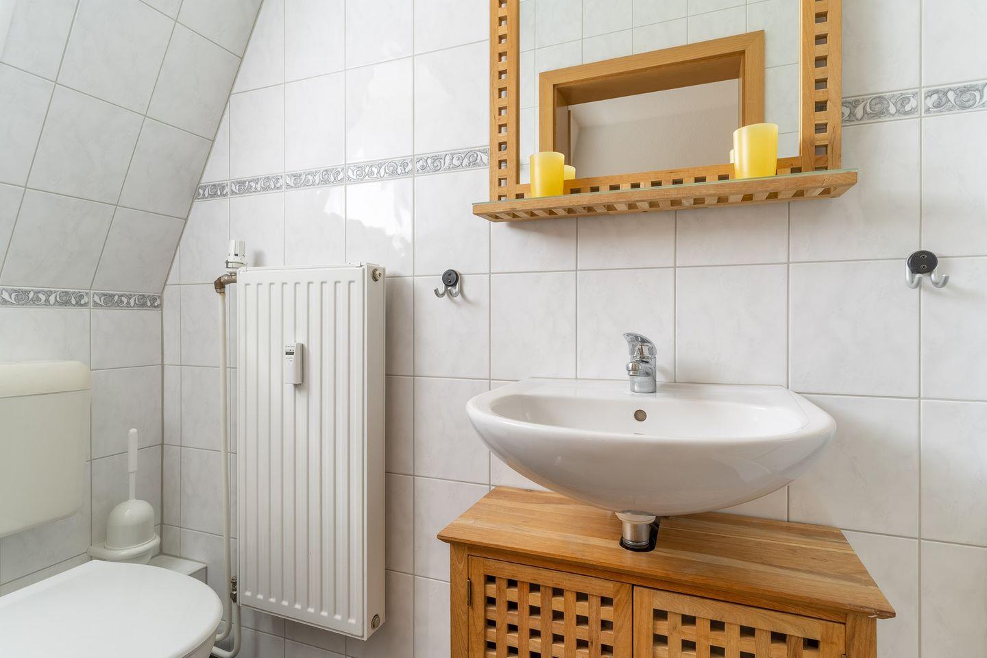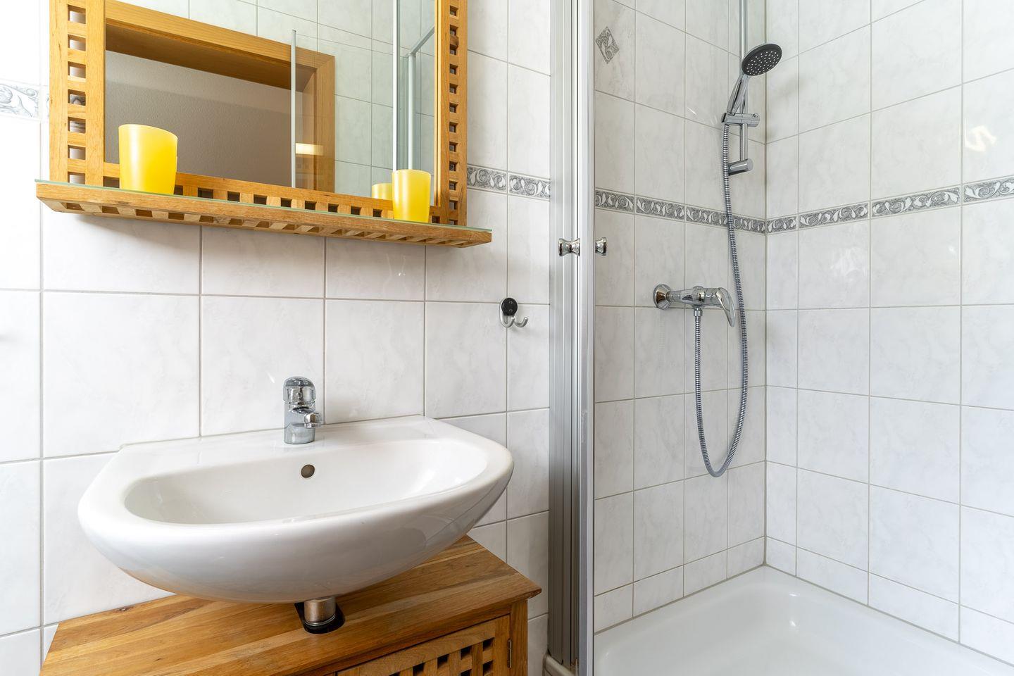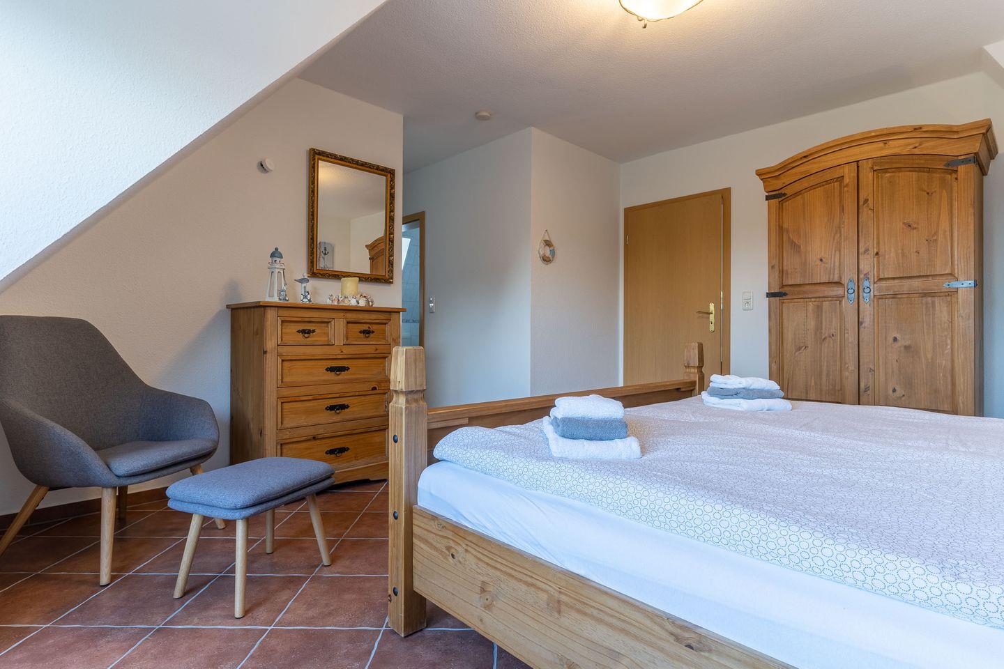 Das Schlafzimmer mit 2 Nachttischen und einem Kleiderschrank bietet ein bequemes Doppelbett (1,80 x 2,00 m), während sich im zweiten Schlafzimmer (ohne Tür zwischen beiden Schlafräumen) ein Schlafsofa befindet. Das Badezimmer ist mit Dusche, Waschbecken und WC ausgestattet und bietet alles, was Sie für eine entspannende Auszeit benötigen.