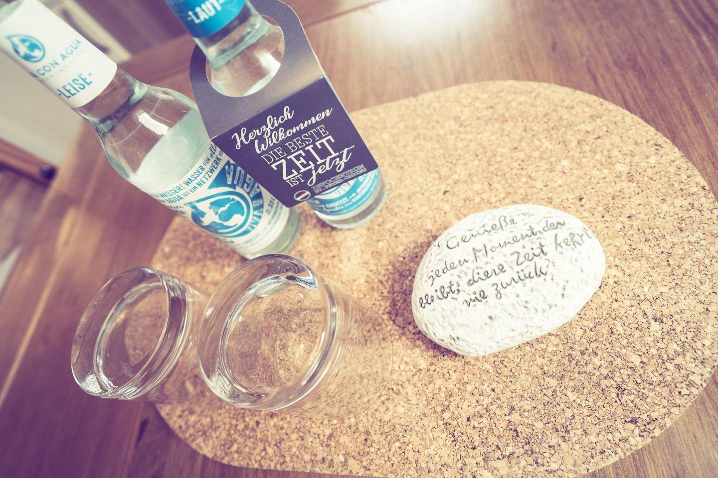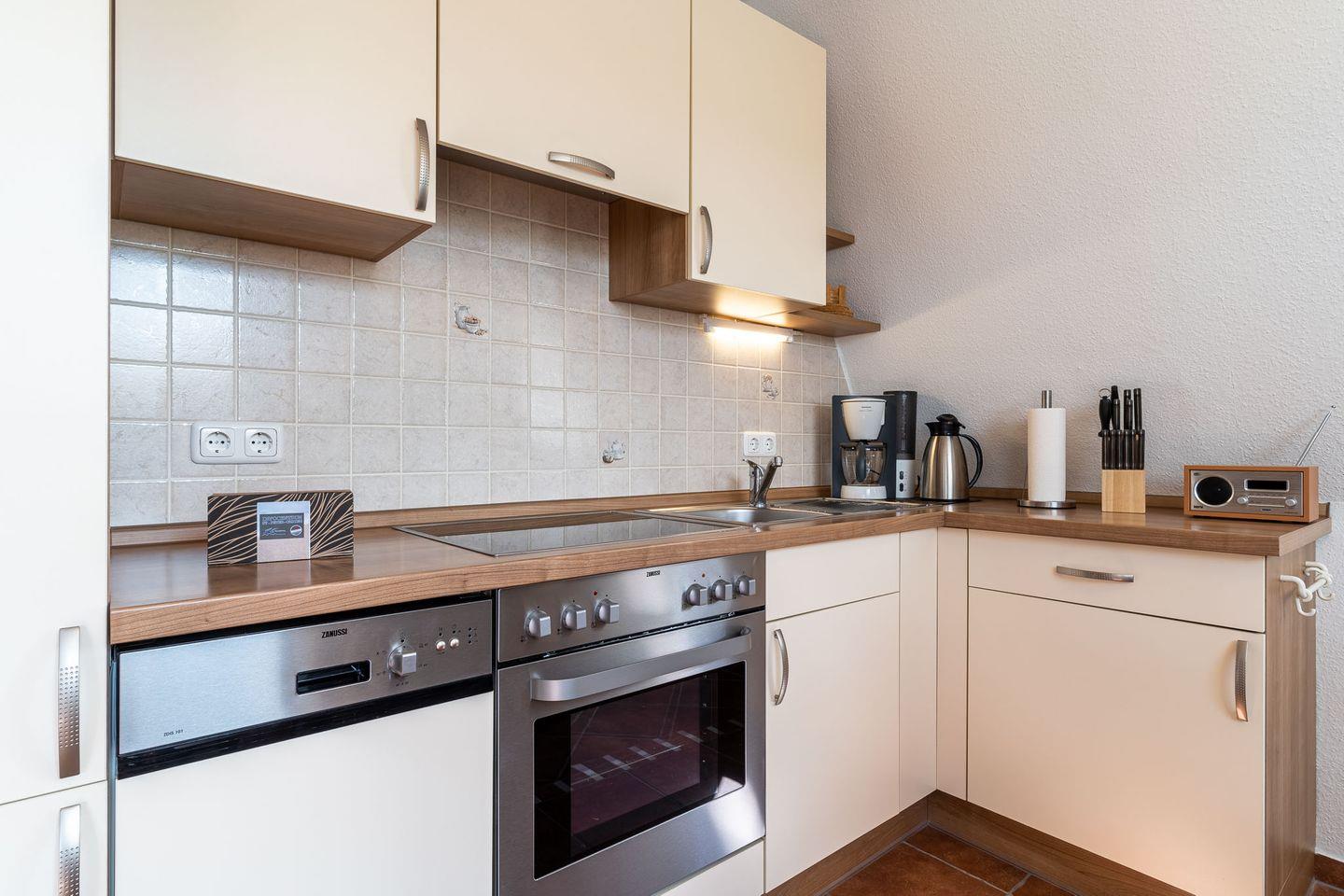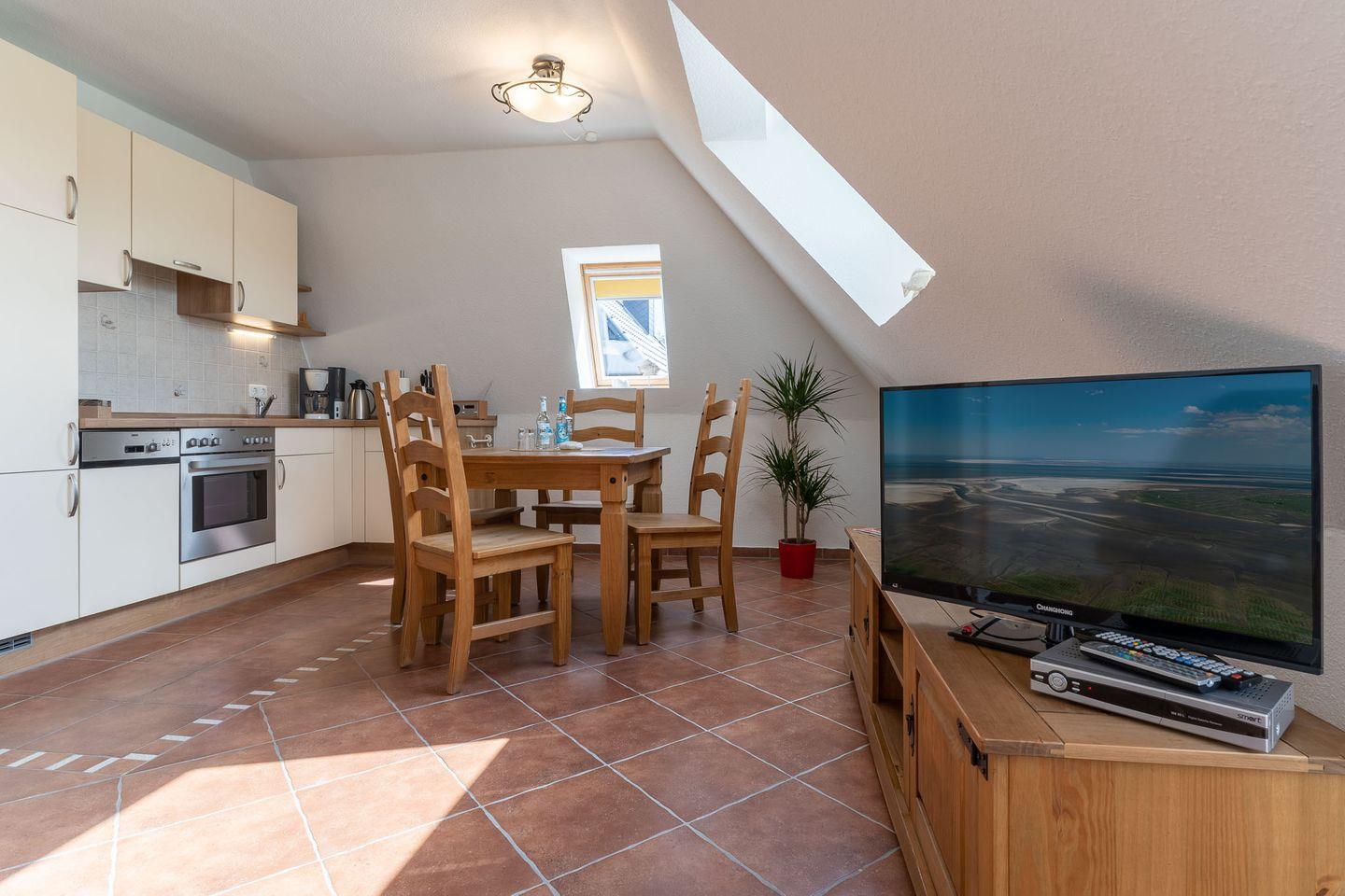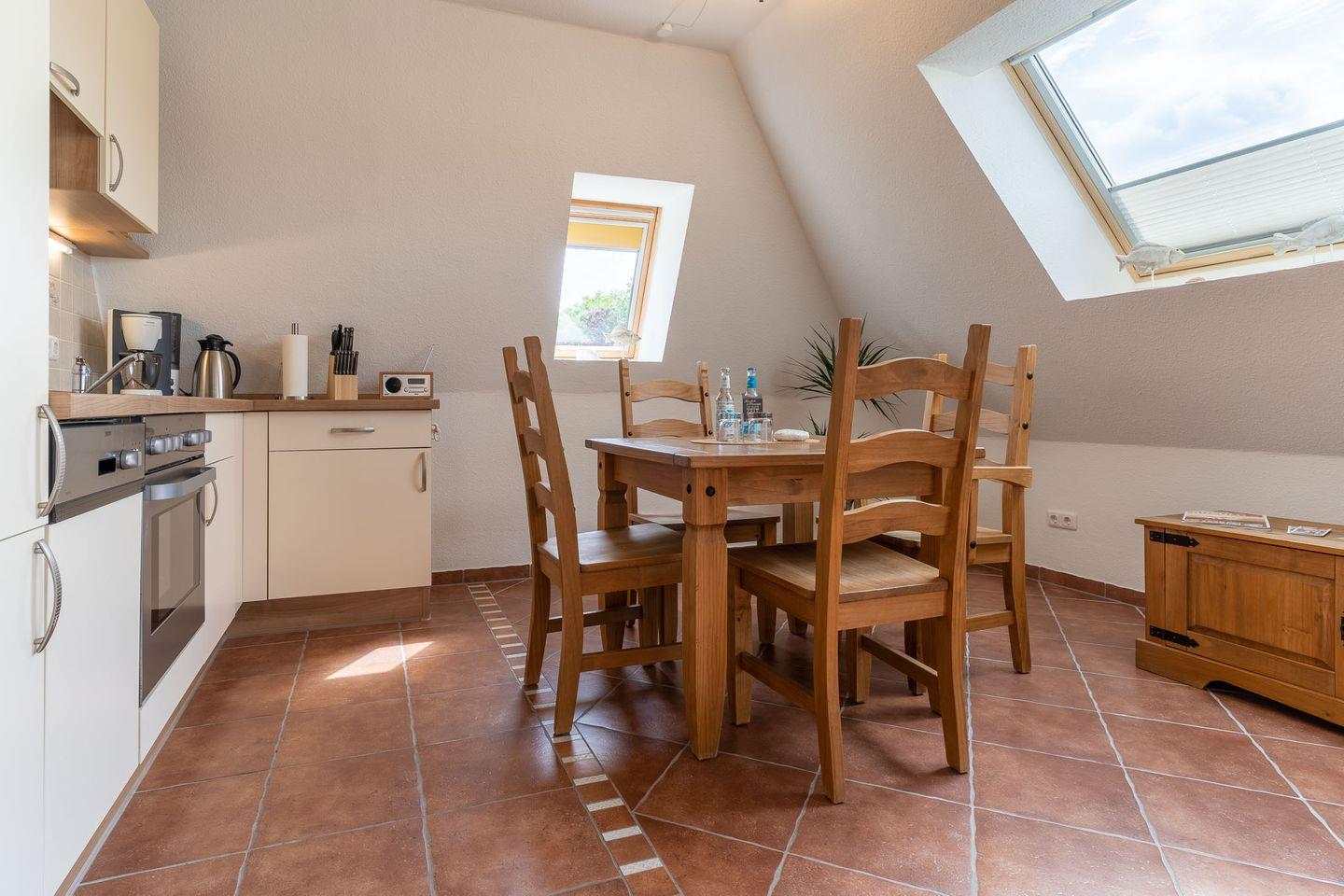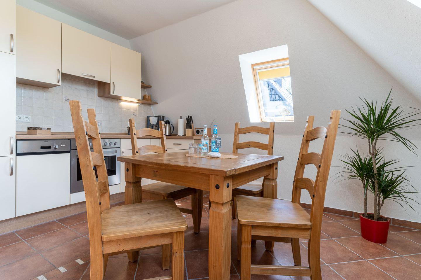 Willkommen in unserer charmanten Ferienwohnung mit ca. 65 qm Wohnfläche im 1. Obergeschoss. Betreten Sie die Wohnung und gelangen Sie in den kleinen Flur mit Garderobe, der Sie direkt in die geräumige und gemütliche Wohnküche führt. Hier finden Sie alles, was Sie für einen angenehmen Aufenthalt benötigen: Eine bequeme Couch mit Couchtisch und 1 Sessel mit Hocker laden zum Entspannen ein, während ein Esstisch mit 4 Stühlen Platz zum Speisen bietet. Die voll ausgestattete Küchenzeile verfügt über einen Herd mit Ceranfeld und Backofen, Geschirrspüler und Geschirr sowie eine Kaffeemaschine, Kochtöpfe, Kühlschrank, Toaster und Wasserkocher.