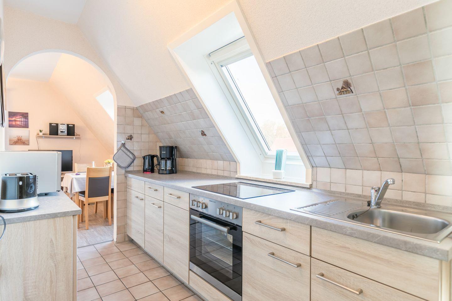 Einbauküche, Herd mit Cerankochfeld, Backofen, Kühlschrank mit Gefrierfach, Geschirrspüler, Kaffeemaschine, Mikrowelle, Wasserkocher, Toaster, Dachfenster mit Verdunkelungsjalousie