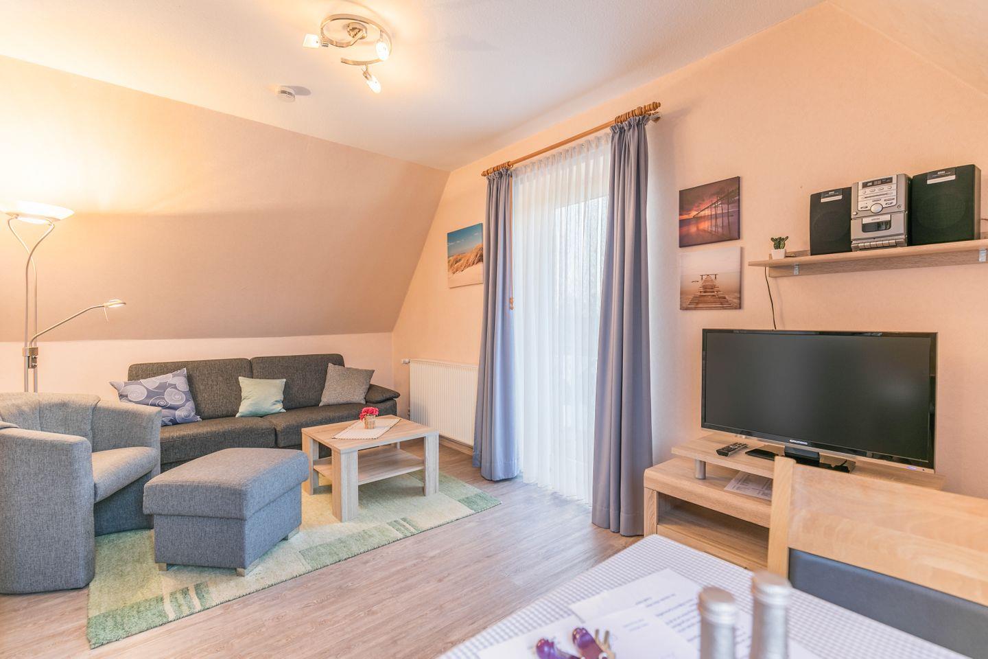 Sofa mit Schlaffunktion , 2 Ledersessel, Fußhocker, Couchtisch, Flachbild-TV, Schrank, Radio, CD-Player, Esstisch mit 4 Stühlen, Zugang zum Balkon mit Südlage