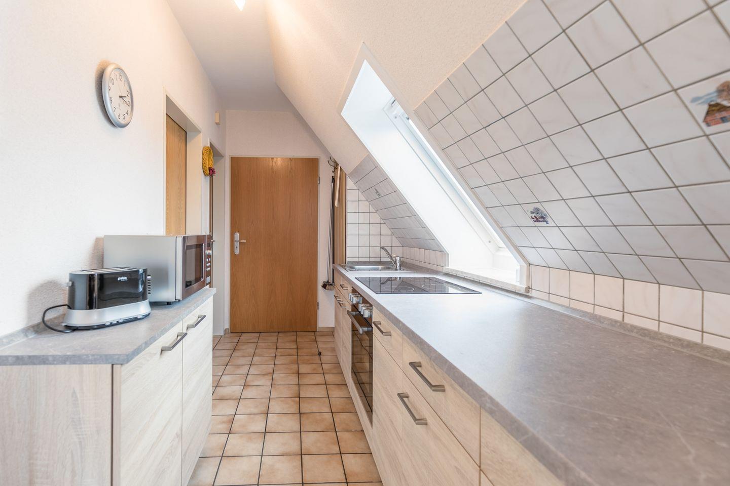 Einbauküche, Herd mit Cerankochfeld, Backofen, Kühlschrank mit Gefrierfach, Geschirrspüler, Kaffeemaschine, Mikrowelle, Wasserkocher, Toaster, Dachfenster mit Verdunkelungsjalousie
