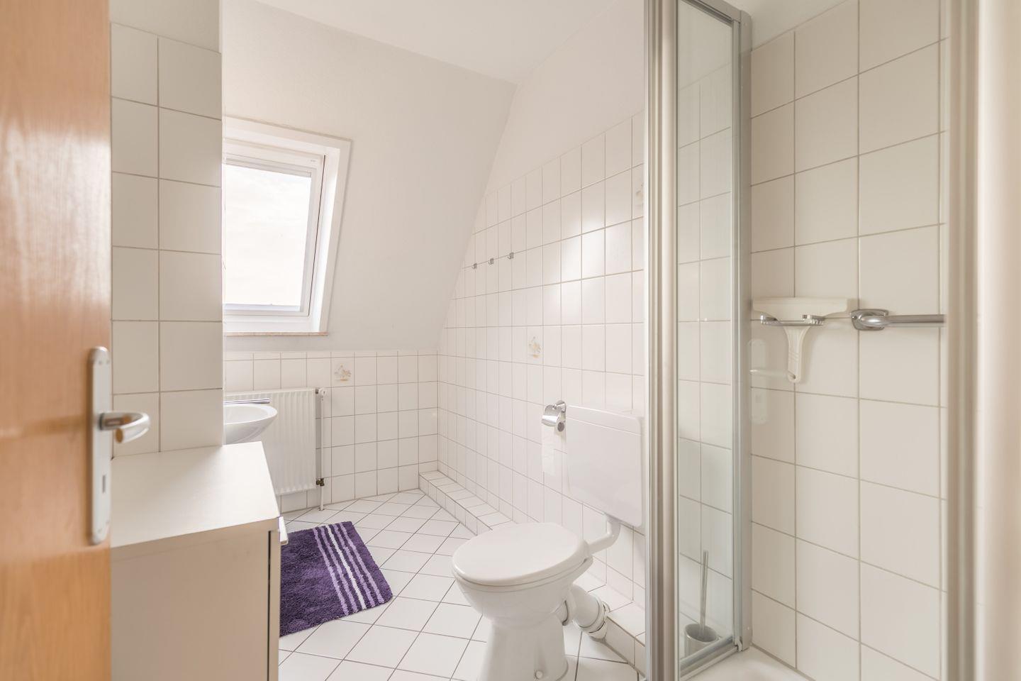 Dusche, WC, Spiegel, Waschbecken, Haartrockner, Hängeschrank, Dachfenster mit Verdunkelungsjalousie