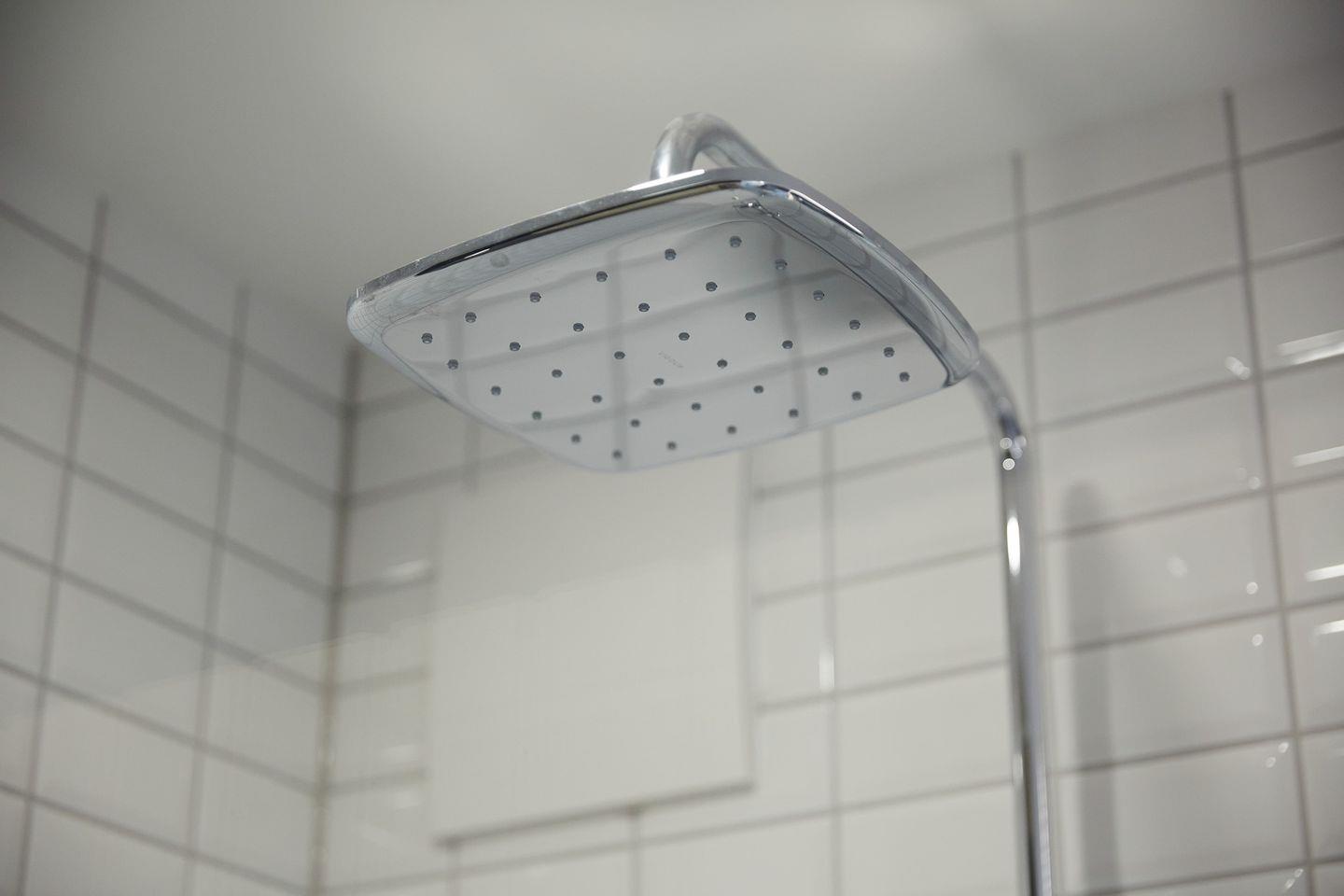Das luxuriöse Badezimmer verfügt über eine große ebenerdige Dusche, einen Handtuchheizkörper sowie einen Föhn.