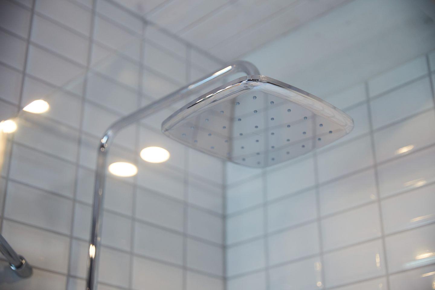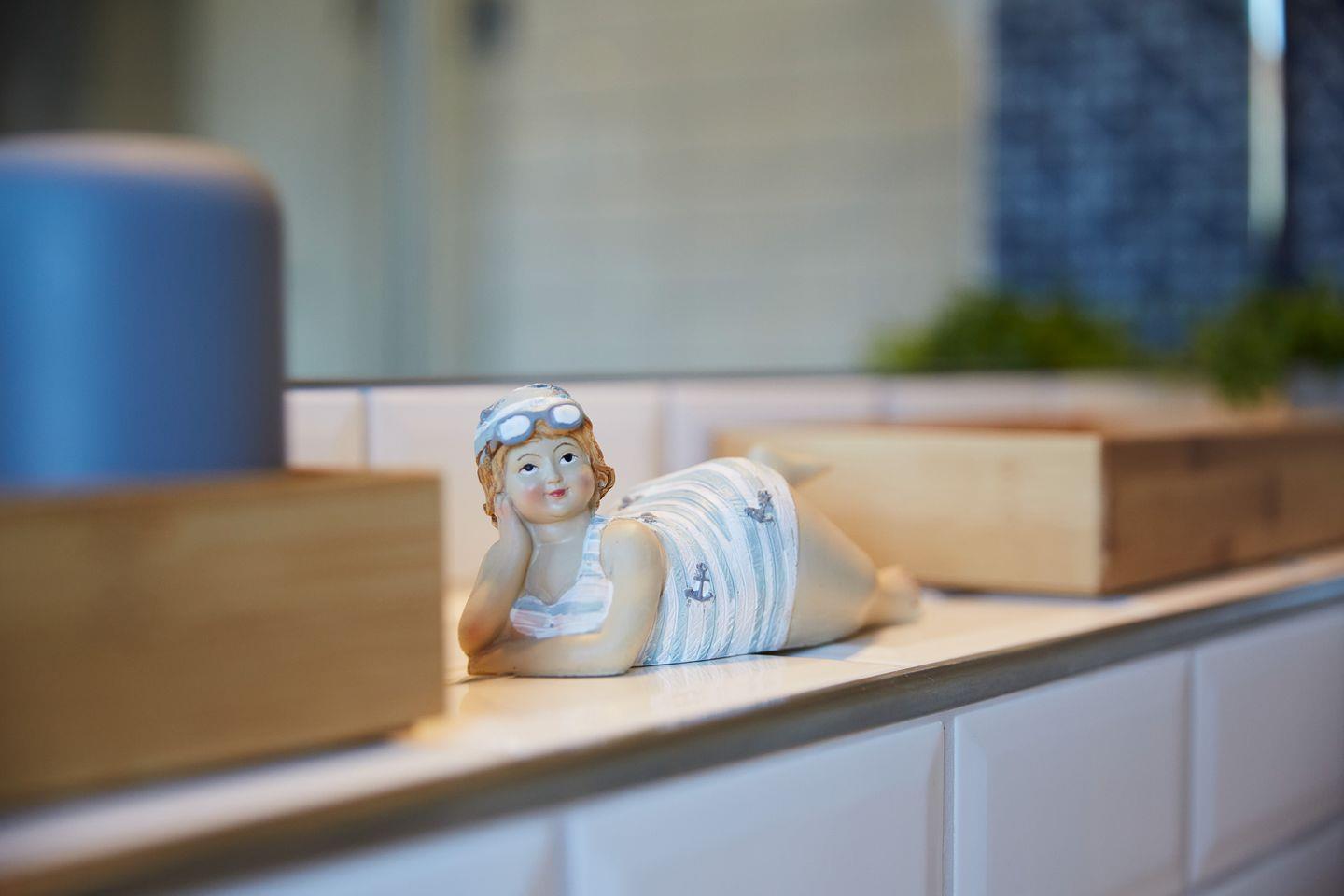 Das luxuriöse Badezimmer verfügt über eine große ebenerdige Dusche, einen Handtuchheizkörper sowie einen Föhn. Wie in der gesamten Wohnung, fällt auch hier die liebevolle Dekoration auf.