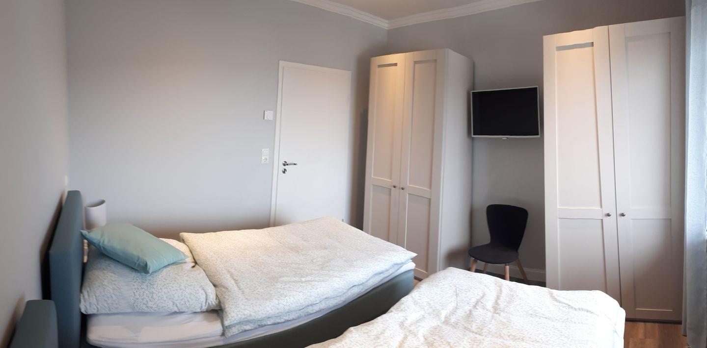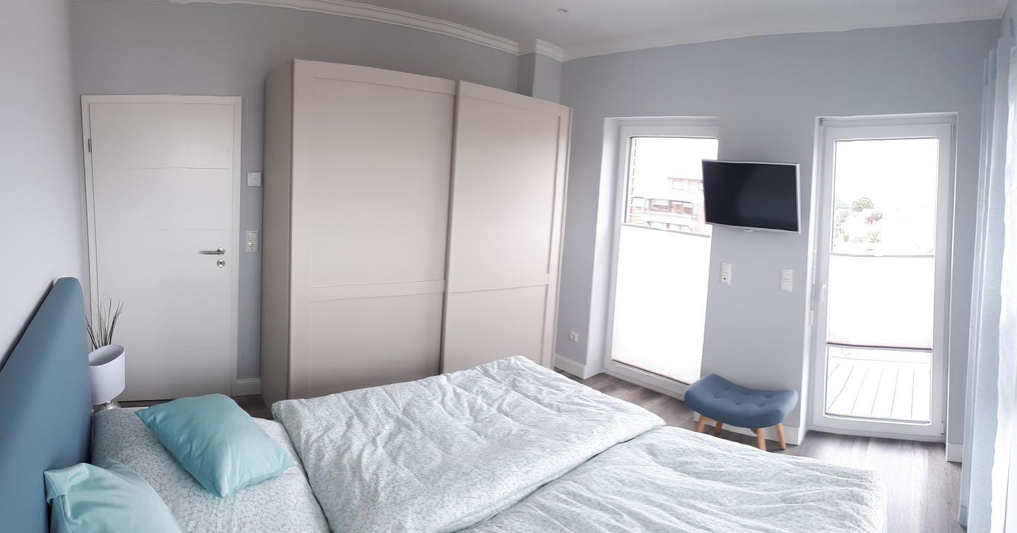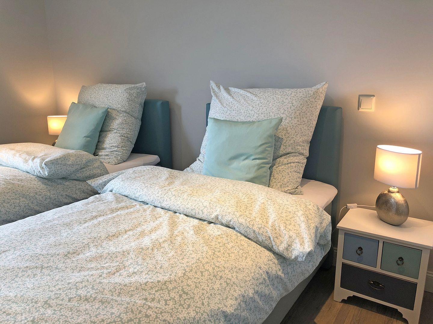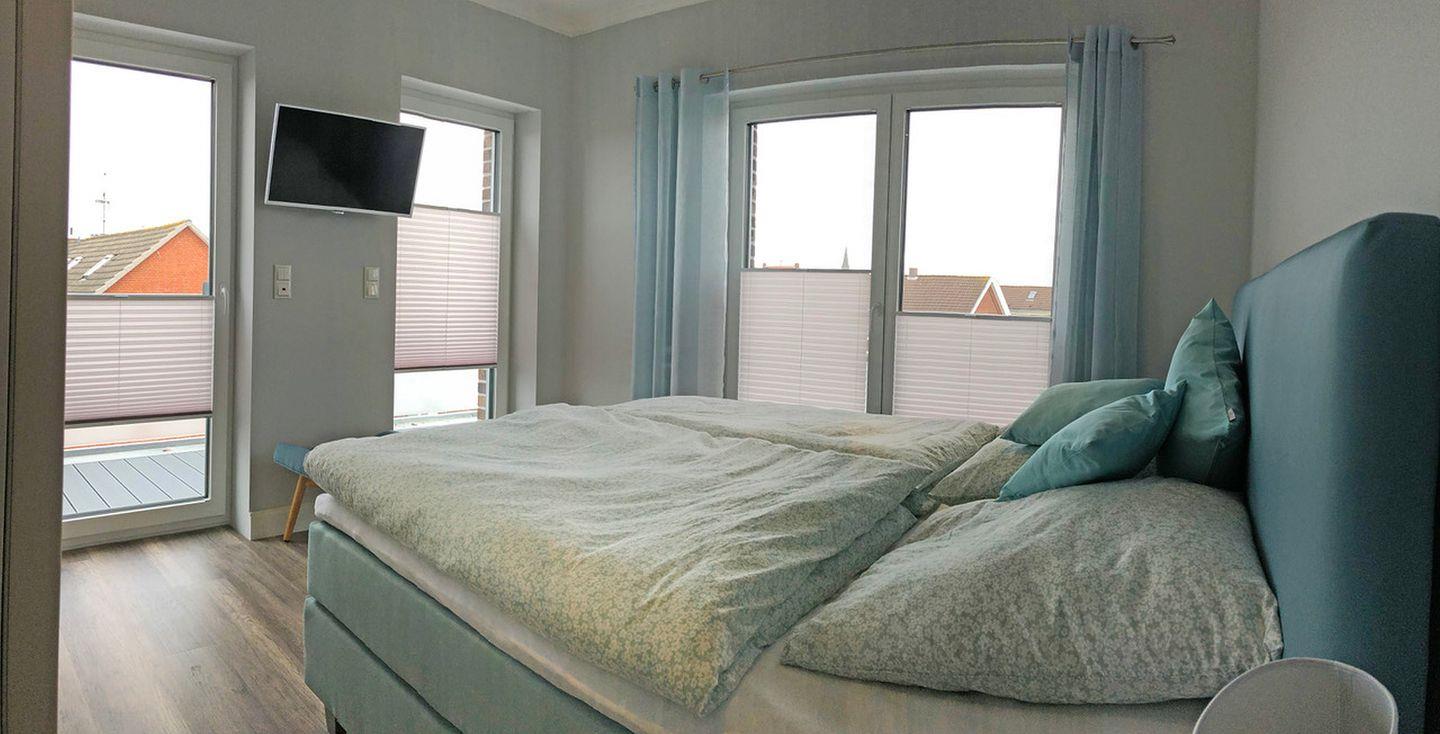 Das eine Schlafzimmer ist mit einem Boxspring- Doppelbett (2m x 2m mit durchgehendem Topper) eingerichtet, hier gibt es noch einen zusätzlichen Balkon (Norden). In dem zweiten Schlafzimmer stehen 2 Boxspring- Einzelbetten bereit. Beide Schlafzimmer mit TV. Wie in der ganzen Wohnung sind die Fenster mit Plissees und elektrischen Außenjalousien bestückt. Nach einer erholsamen Nacht sind Sie so wieder für einen neuen Urlaubstag bereit. Das elegante Tageslicht-Badezimmer mit geräumiger sowie bodengleicher Dusche rundet diese Ferienwohnung ab und macht den Start in den Tag perfekt.