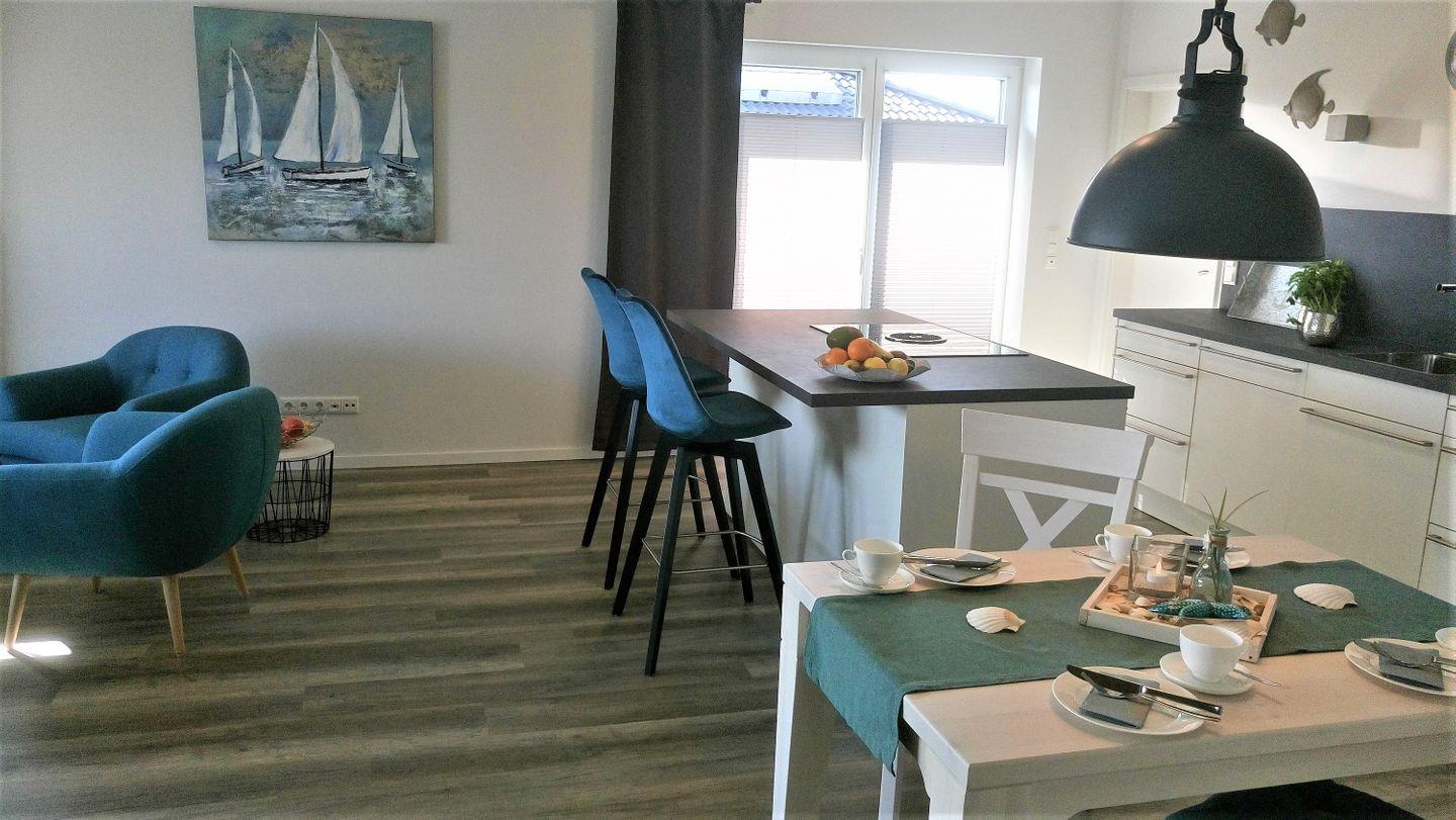 In dem modernen und mit viel Liebe eingerichtetem Wohn- Essbereich werden Sie sich sicher wohl fühlen. Bequeme Wohnzimmermöbel stehen Ihnen in der Chill-Ecke mit TV zur Verfügung. An dem Esstisch, vor der hochwertig und komplett eingerichteten Küchenzeile mit Kochinsel, können Sie sich die Zeit mit netten Gesprächen oder leckerem Essen vertreiben.