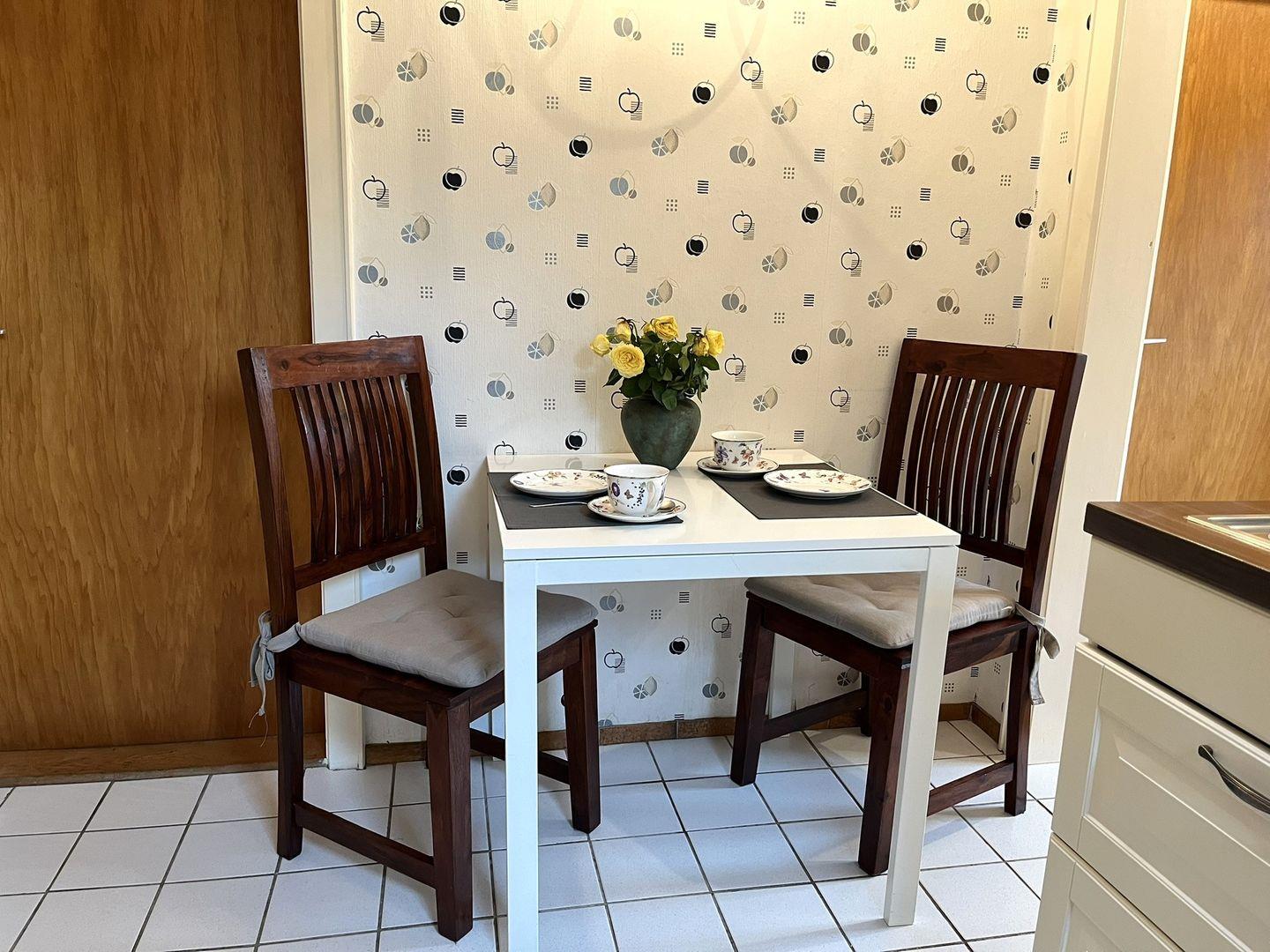 Die separate, gemütliche Küche mit Esstisch lädt zum Verweilen ein und ist neben Kaffeemaschine, Toaster und einem Herd, noch mit einem Pizzaofen ausgestattet.