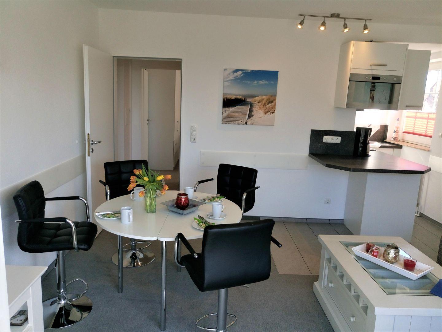Von dort gelangen Sie in den lichtdurchfluteten, geschmackvoll eingerichteten Wohn-/ Essbereich, in dem eine Wohnlandschaft den nötigen Platz für Gemütlichkeit bietet. Für die Unterhaltung befinden sich hier ein TV- Gerät, eine Audioanlage mit iPhone-und USB- Anschluss, sowie einen Blu- Ray- Player. Die in dem Wohnraum integrierte Küchenzeile ist sehr gut ausgestattet, mit Geschirrspüler, Mikrowelle, Induktionsherd, Dunstabzugshaube und diversen Küchenutensilien, so dass Sie sich problemlos selber mit Köstlichkeiten von der Küste versorgen können. Ein ausklappbarer Esstisch bietet hierfür den nötigen Platz. Den schnellen Kaffee kann man an dem Küchentresen mit den 2 Barstühlen zu sich nehmen.