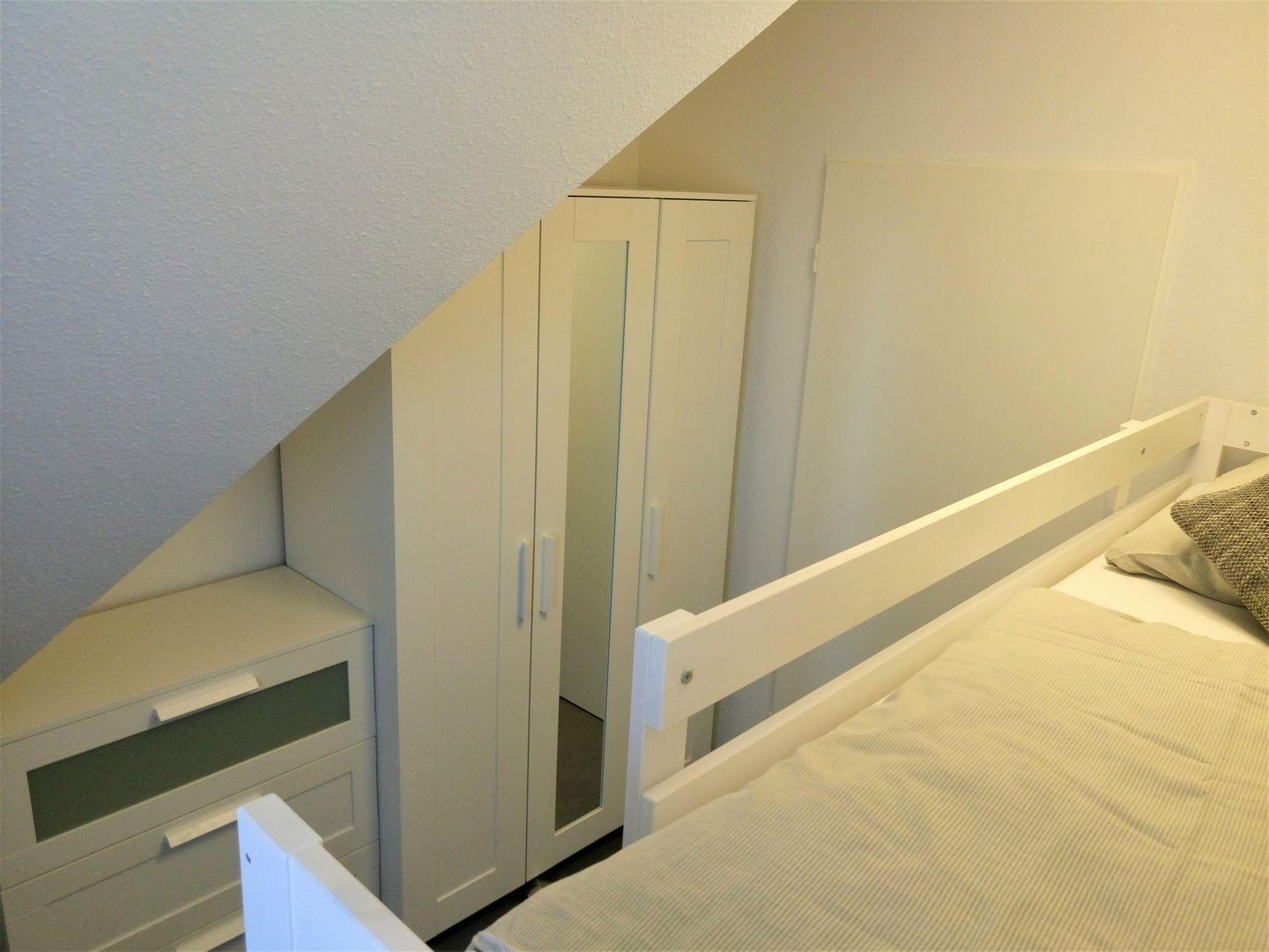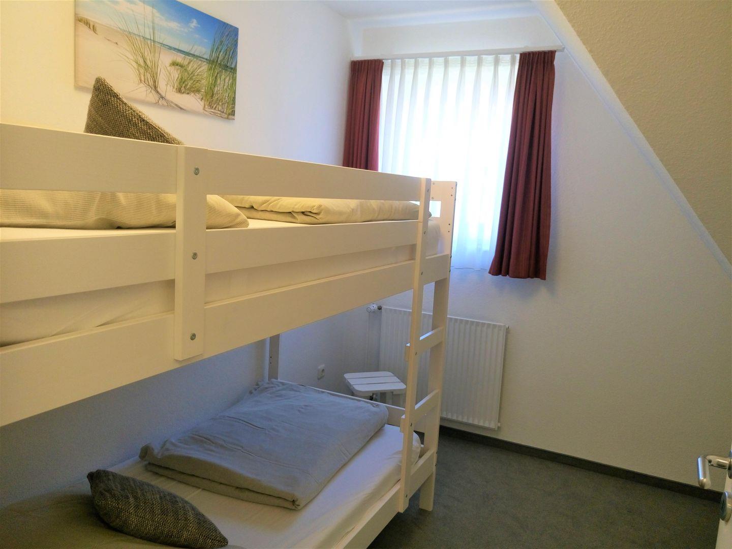 Eines der Schlafzimmer ist mit einem hochwertigen Boxspring- Doppelbett (durchgehende Matratze) und einem Kleiderschrank eingerichtet. Hier ist auch genügend Platz, um ein Baby- Reisebett aufzustellen. In dem zweiten, weiteren Schlafzimmer kann man es sich in einem Etagenbett bequem machen. Auch hier gibt es einen Kleiderschrank.
