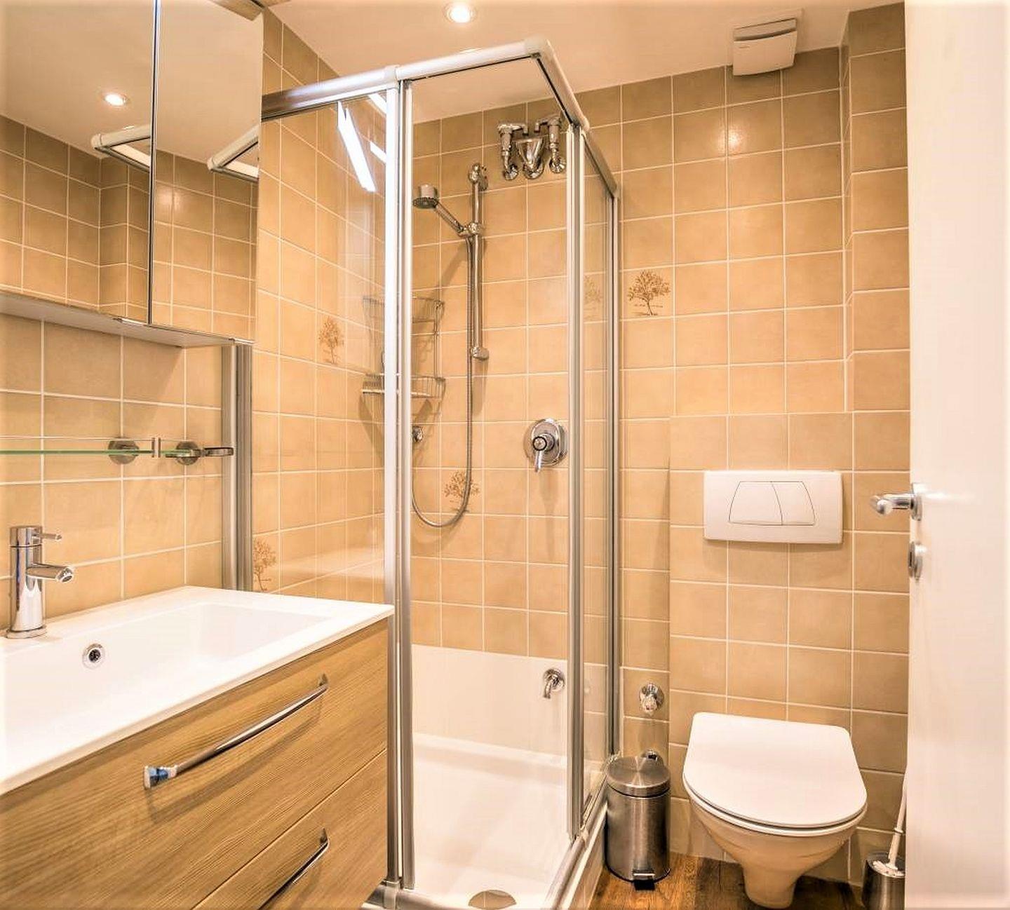 Ein Duschbad mit Waschtisch, Handtuchwärmer, Föhn und 3D- Spiegelschrank komplettiert diese Wohnung.