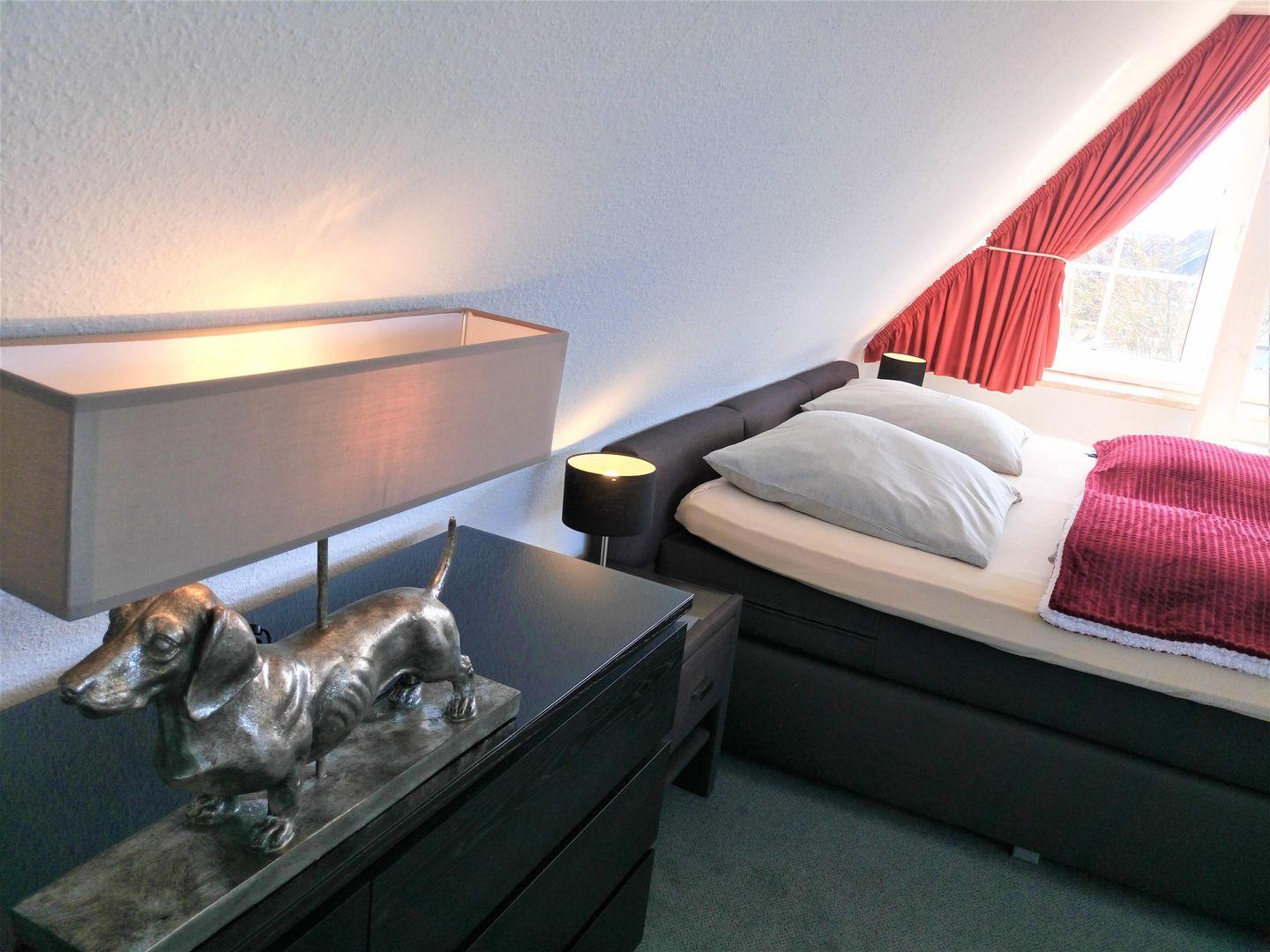 Von dort gelangen Sie in den geschmackvoll eingerichteten Wohn-, Ess- Schlafbereich, eine Couch bietet den nötigen Platz für Gemütlichkeit, hier gibt es für die Unterhaltung ein TV- Gerät, eine Audioanlage mit iPhone und USB- Anschluss, sowie einen Blu- ray- Player. Das hochwertige Boxspring- Doppelbett (2mx 2m, zwei Matratzen, durchgehender Topper) in diesem Raum lässt Sie mit Sicherheit gut schlafen.