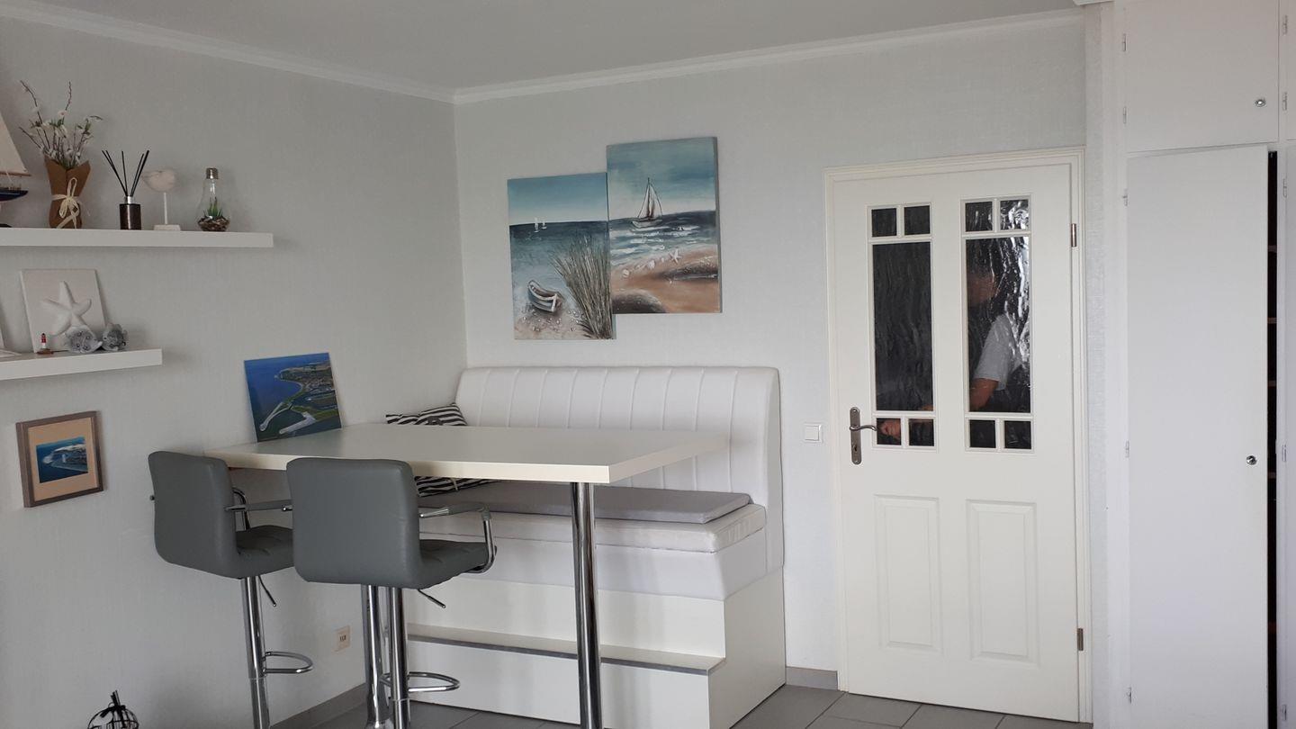 Durch das große Panoramafenster steht ein heller, freundlicher Wohn- Schlafraumraum zur Verfügung. Ein bequemes Doppelbett (1,80x 2m, durchgehende Matratze) und ein 2- Sitzer- Sofa laden dazu ein es sich gemütlich zu machen. Für Ihre Urlaubsgarderobe steht ein ausreichend großer Kleiderschrank bereit. Mit Leckereien aus der Region kann man sich an dem Hochtisch mit Sitzbank und Stühlen selbst ein bisschen verwöhnen. Die Wohnung hat eine separate, gut ausgestattete Küche, die sich bestens eignet um sich selber zu verpflegen. Ein Abstellraum zum Unterbringen von Koffern, etc. ist vorhanden. Ein Badezimmer mit Funktionsdusche rundet diese Wohnung ab.