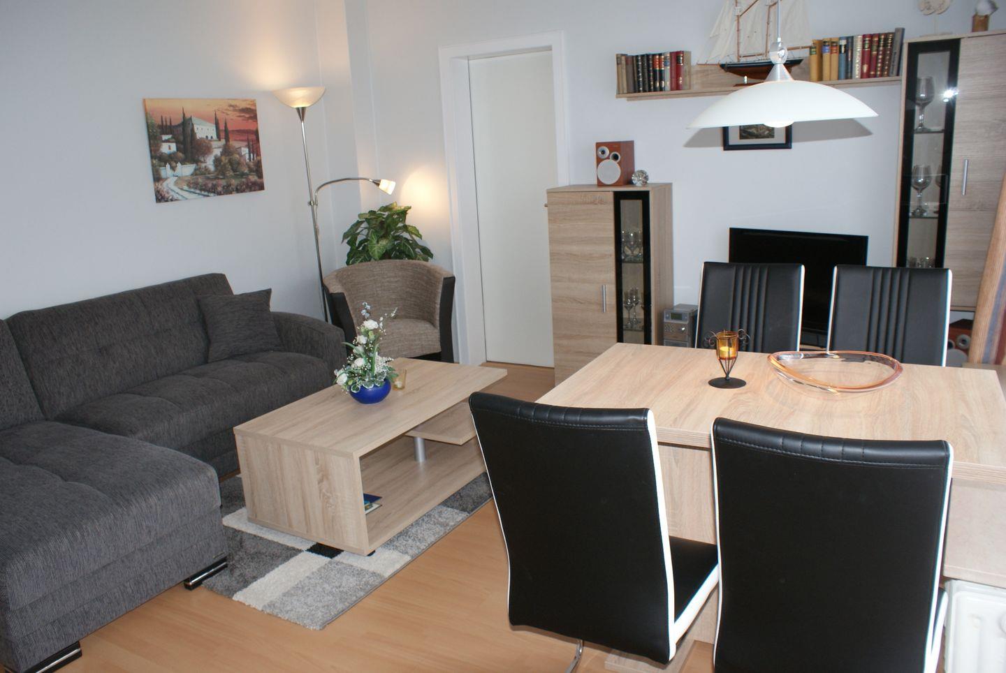 Das helle und gemütliche Wohnzimmer bietet viel Platz zum entspannen, die Couch und der ansprechende Essplatz lassen keine Wünsche offen. Sie werden sich bei uns wie zu Hause fühlen.
