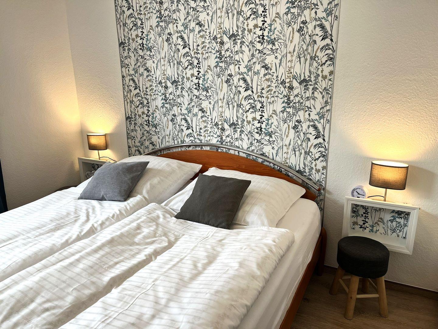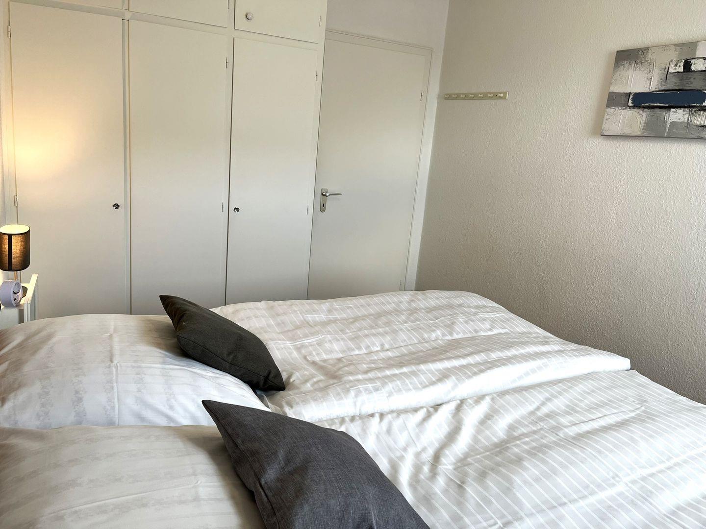 Das schicke Schlafzimmer mit einem Doppelbett und einem geräumigen Kleiderschrank sorgt für den nötigen Erholungsschlaf, um in den nächsten Urlaubstag zu starten.