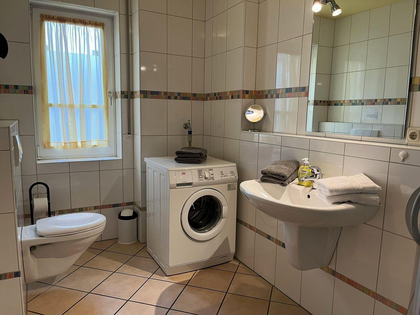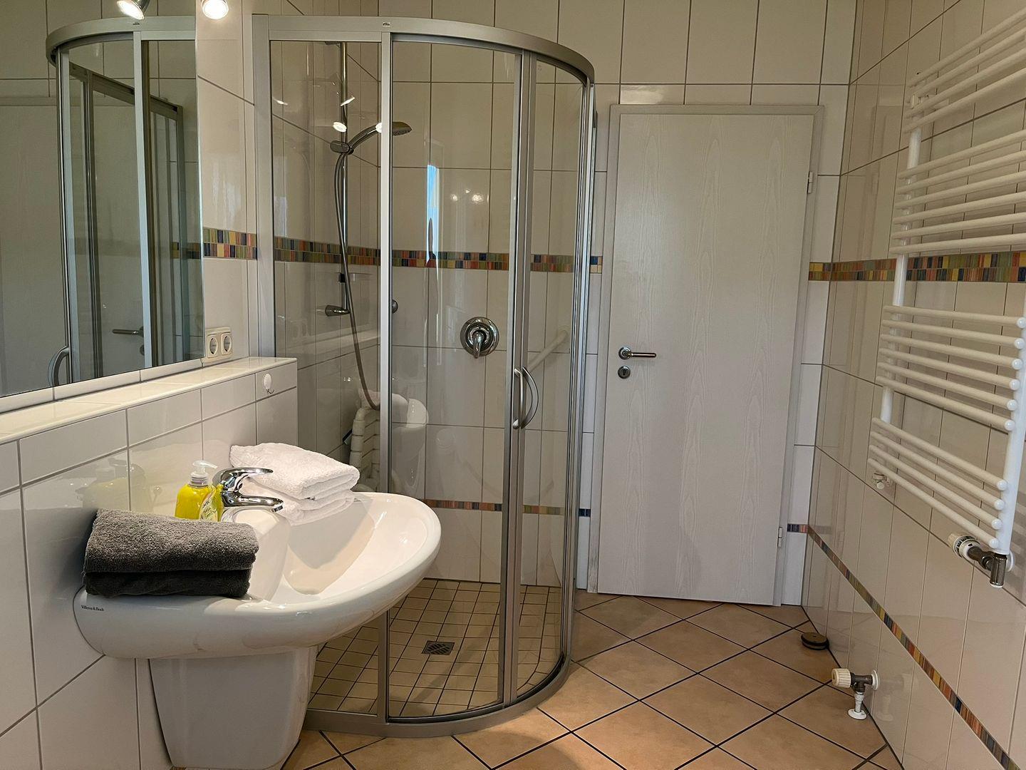 Das Tageslichtbad mit Handtuchwärmer, Fußbodenheizung und einer bodengleichen Dusche macht diese Ferienwohnung perfekt für einen tollen Urlaub.