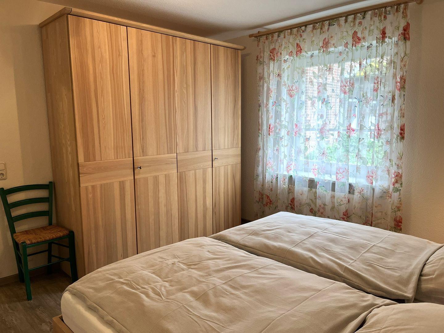 Ein Schlafzimmer mit Doppelbett (2 Einzelmatratzen) und einem großen Kleiderschrank, und ein Gästezimmer mit einer Schlafcouch bietet erholsame Nachtstunden für eine 3.Person.