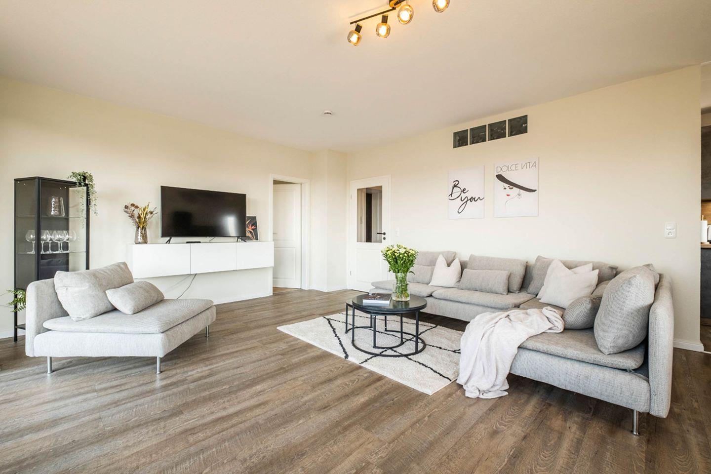 Die helle, freundliche Ferienwohnung verfügt über ein Schlafzimmer, ein geräumiges Wohnzimmer mit integriertem Essbereich und einer Küche. selbstverständlich gehört auch ein Duschbad zur Ferienwohnung. Hier ist die Dusche ist mit einem Haltegriff versehen. Die Wohnung verfügt über elektrische Außenjalousien. Der Wohn- und Schlafraum wurde Anfang des Jahres 2023 modernisiert und mit neuen Möbeln ausgestattet.
