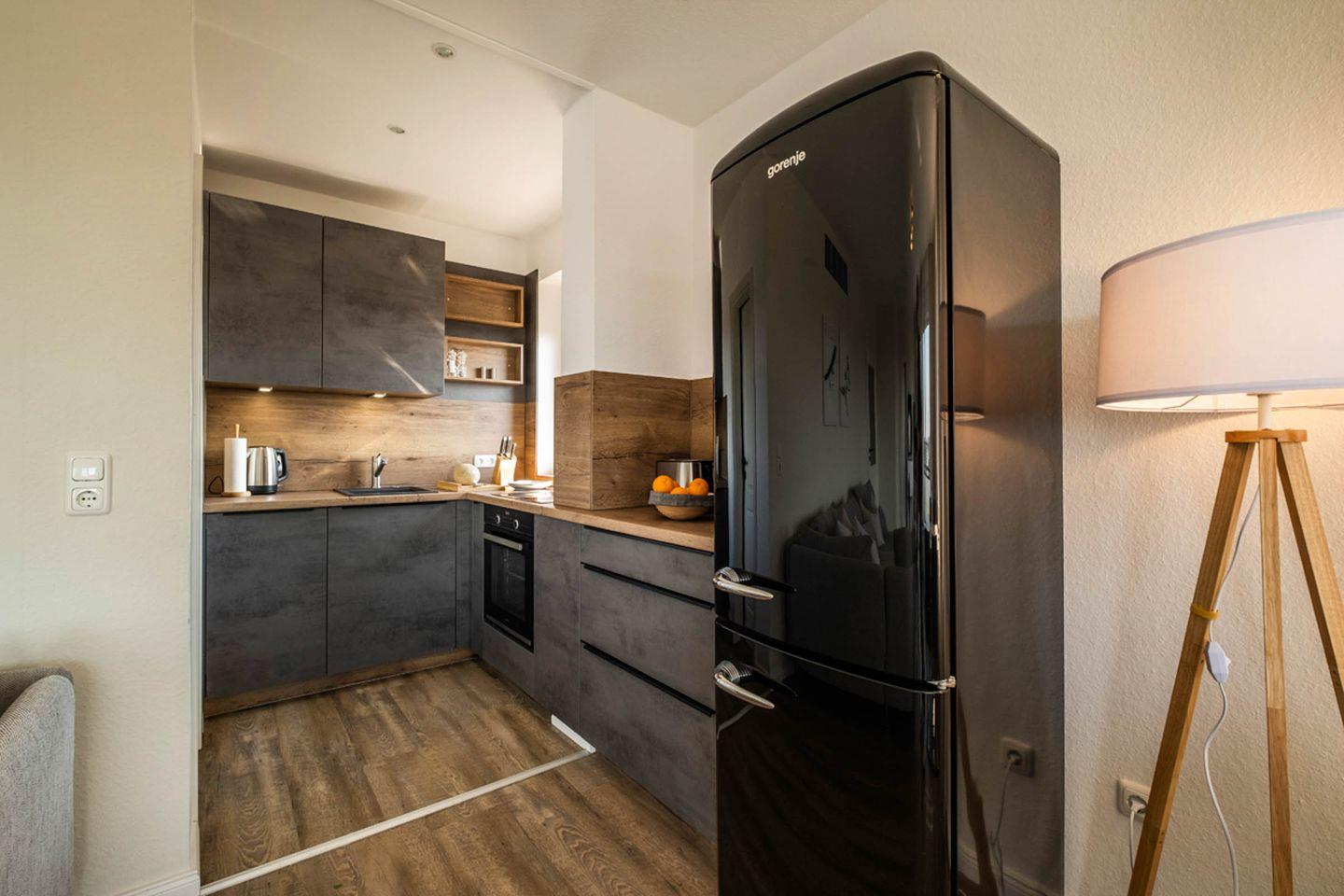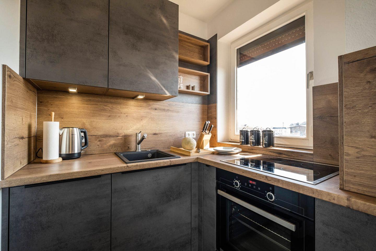 Die neue Küche verfügt über ein Cerankochfeld, einen Backofen, einen Kühlschrank mit Gefrierfach, eine Geschirrspülmaschine und eine Kaffeemaschine.