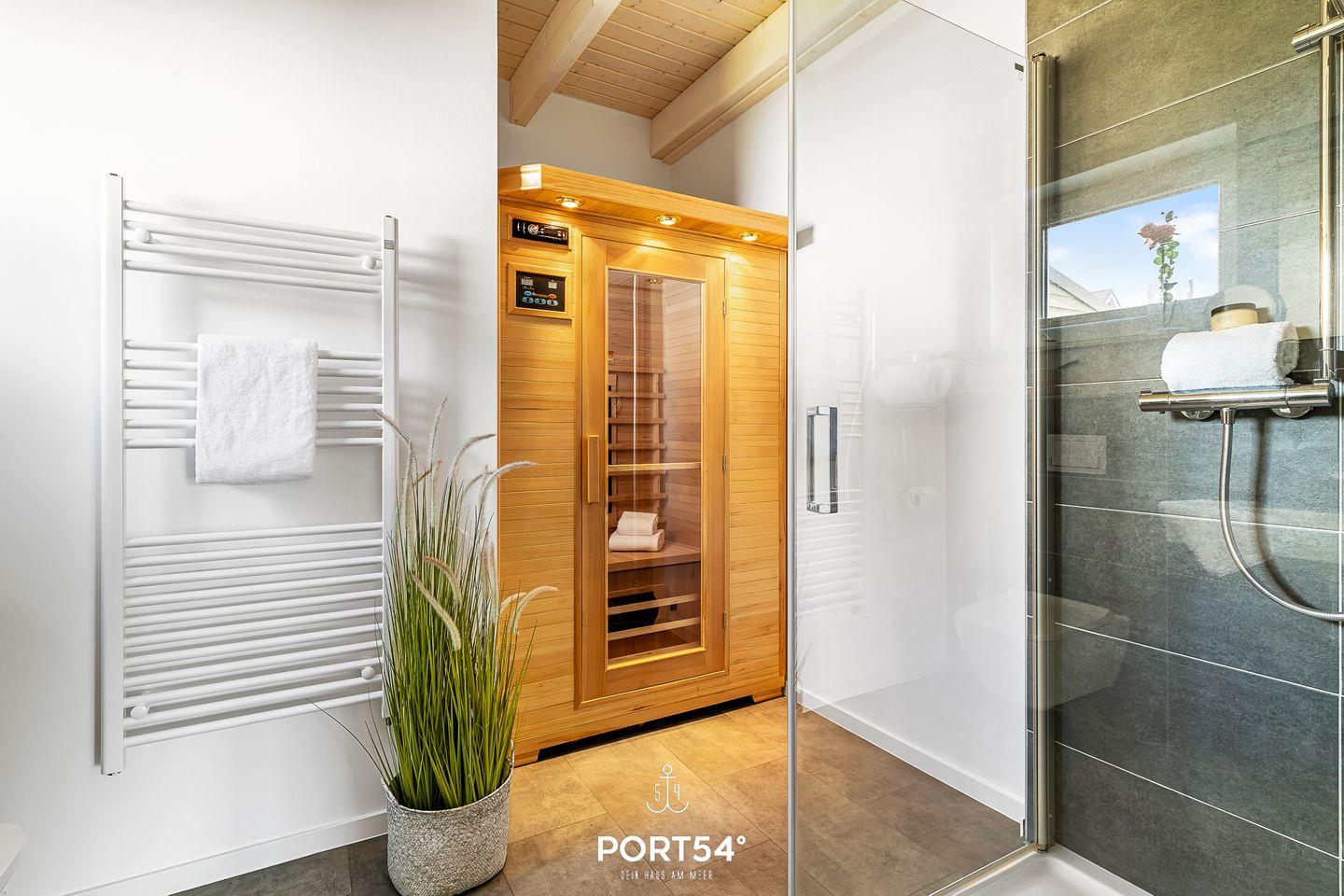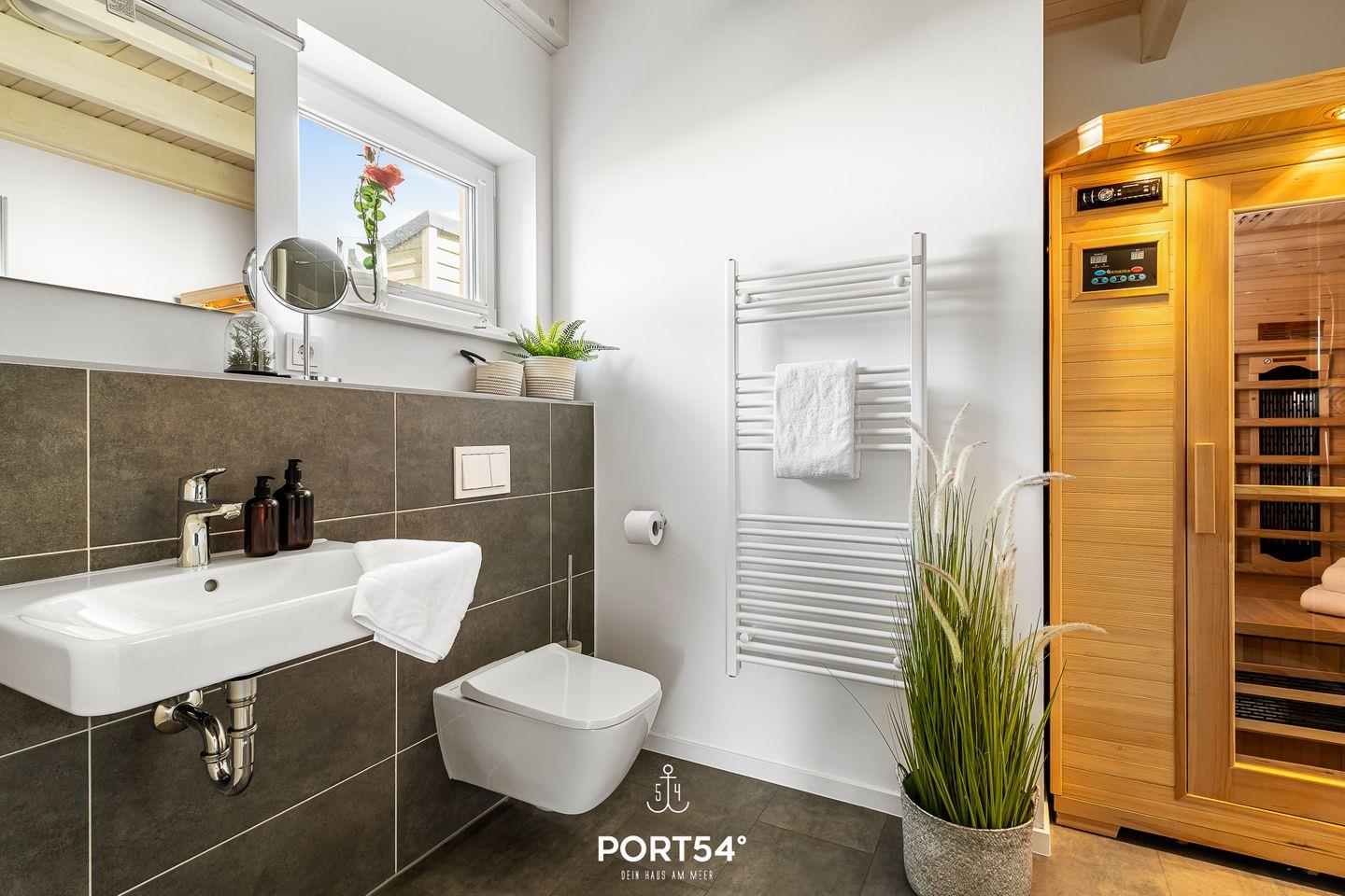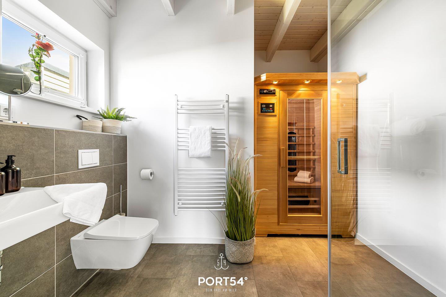 Für zusätzlichen Komfort stehen dir zwei Badezimmer zur Verfügung: Im Erdgeschoss findest du ein Badezimmer mit Dusche und einer Infrarot-Sauna, die nach einem aktiven Tag an der Nordsee für wohltuende Entspannung sorgt. Im Obergeschoss lädt ein weiteres Badezimmer mit Badewanne zum Abschalten ein.